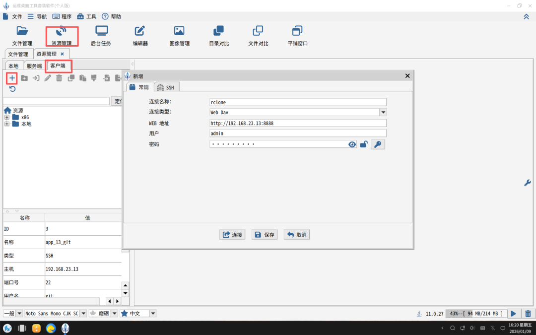 搭建好WebDAV后,就轮到咱们的倚天剑DESK登场了。点击“资源管理”->“客户端”->“新增”按钮。如下图所示:
