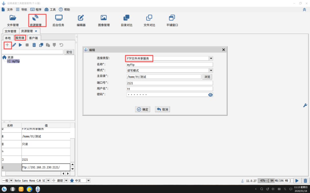 打开DESK软件后,点击“资源管理”-> “服务器”-> “新增”-> “FTP文件共享服务”。