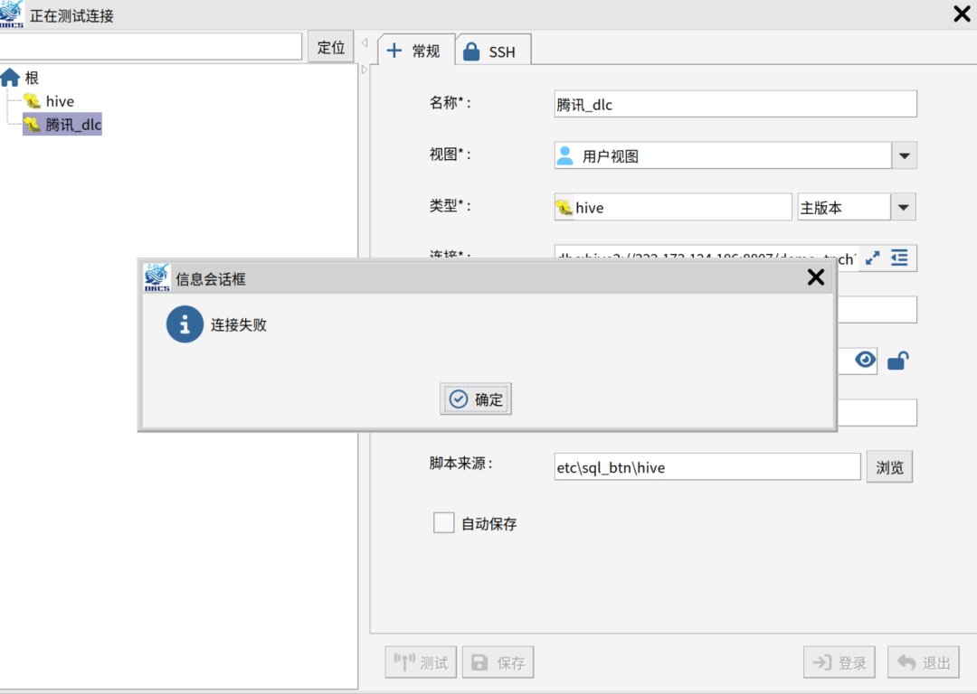 如果你用和原生Hive相同的方法去连接腾讯数据湖,会出现莫名其妙的连接失败,因为腾讯DLC在Hive上做了很多扩展,所以原生的hive驱动已经不能满足。