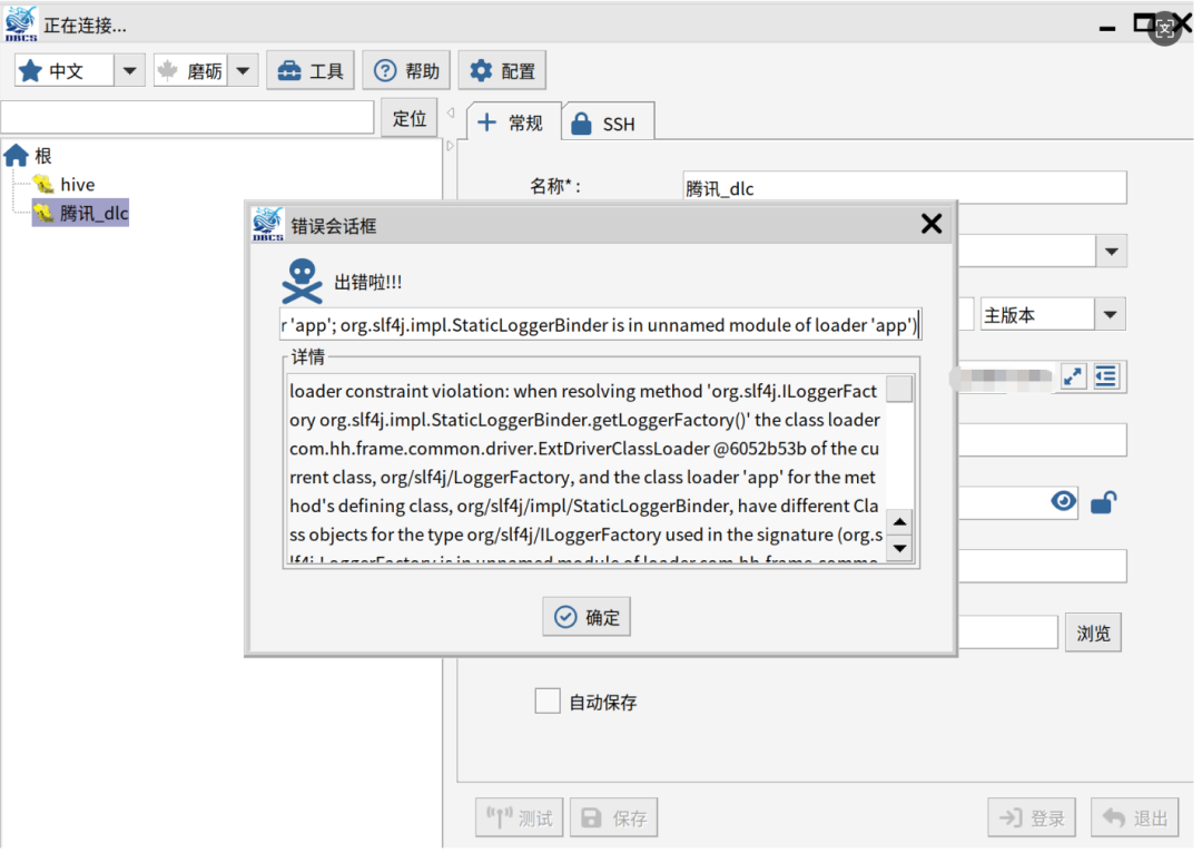 替换hive驱动后,还会弹出如下错误。这个问题是腾讯数据湖驱动中自带的slf4j和DBCS 中用的冲突。