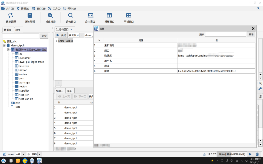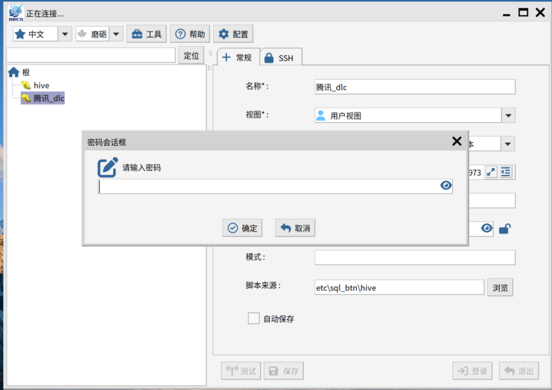 终于,你要成功连接腾讯数据湖了。注意:腾讯湖的连接信息中包括密钥,因此登录时候弹出密码对话框,点击确定即可。