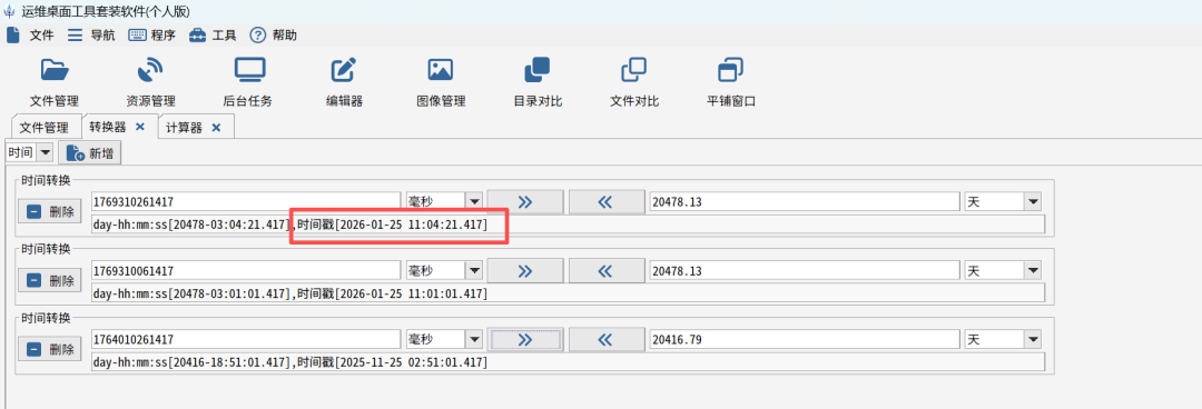 时间转换器不但能实现秒、分钟、小时、天的单位换算,也支持Unix时间戳。Unix时间戳(Unix Timestamp)是指从1970年1月1日00:00:00 UTC(协调世界时)开始所经过的秒数,不考虑闰秒。它被广泛用于计算机系统中记录时间,是一种简单、跨平台的时间表示方式。这个东西没有转换器,大家往往只能写代码转换,耗时耗力不值得,如下图所示:1769310261417是个什么鬼?