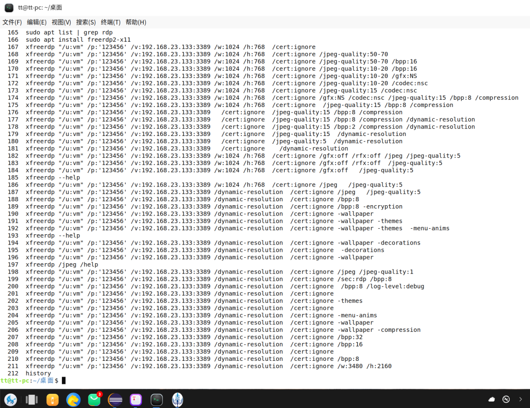 输入xfreerdp --help后,所有参数全出来了,太多了,根本不知道怎么使用。问AI,大部分解答都不对,所以经过一番猜测和如下尝试,终于得出了一点经验。