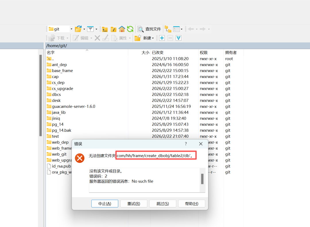 WinSCP是笔者非常喜欢的一款远程文件管理软件,总体来说非常好用,但根本没有考虑这个细节,一旦你输入多目录,WinSCP就出错了如下图。你只能创建一个目录,进入该目录后,再创建下一个,如此反复。