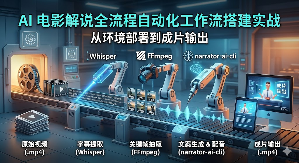 本文的目标是把这条流水线自动化:以 narrator-ai-cli 为执行层,把字幕提取到成片输出的全流程压缩成可复用的脚本,实现批量生产。