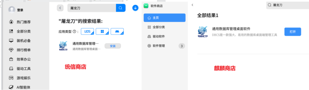 如果大家想从麒麟和统信商店安装,请输入“屠龙刀”立刻就能够定位到。