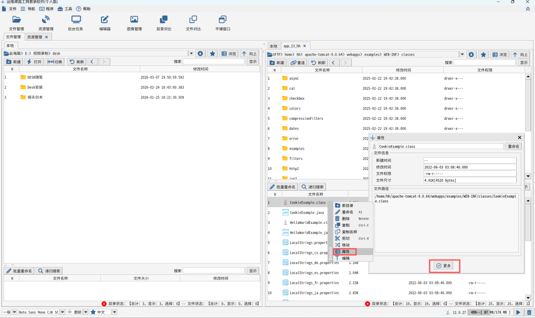 具体过程太简单了,在远程服务器上找到部署应用的class目录,然后右键class文件的属性菜单后,再点击“更多”按钮,如下图所示: