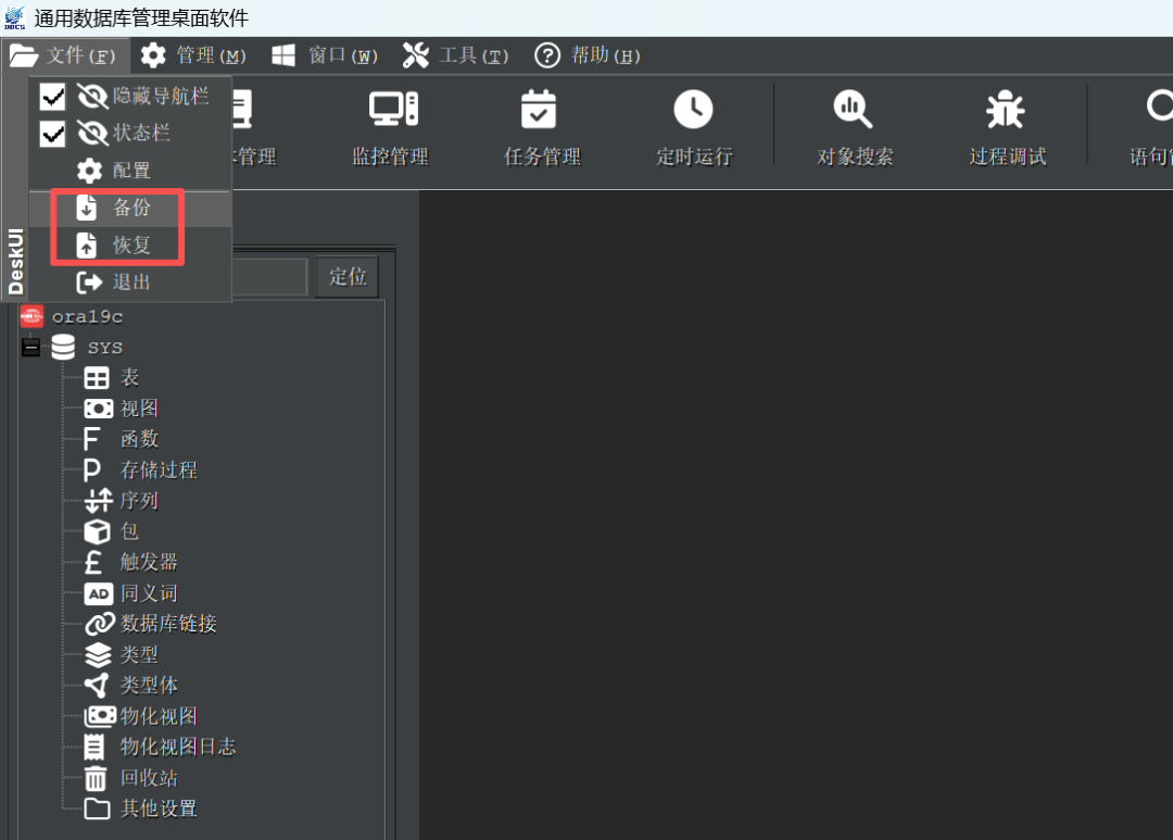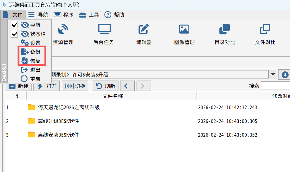 如果大家想备份的快一点,可以使用“文件”菜单下的“备份”和“恢复”菜单项。