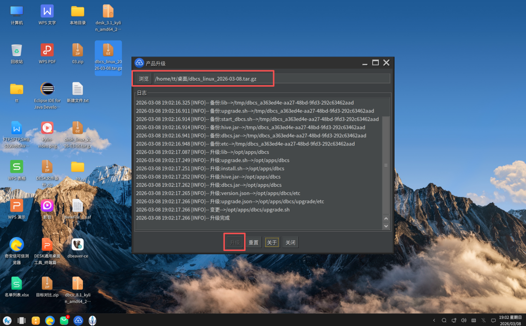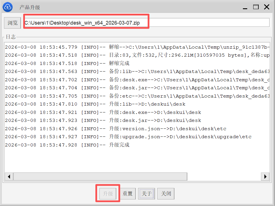 DESK和DBCS的升级过程完全相同,都是在弹出的对话框中选择zip文件,然后点击“升级”按钮。
