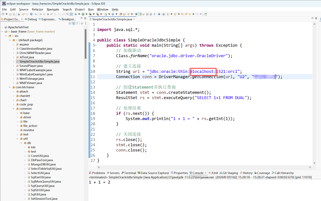 最后使用,运行最简单的代码进行测试(让AI帮你写)。直接调用localhost的1521端口运行成功。恭喜你,现在你可以非常安全的像访问本地数据库一样访问云端Oracle了。