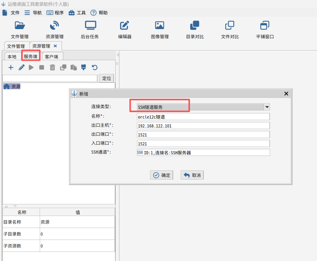 然后在“服务器”页签下创建“SSH隧道服务”,其中“192.168.122.101”就是内网Oracle的IP地址,“出口端口1521”是内网Oracle的端口,“入口端口1521”是本地电脑的映射端口。
