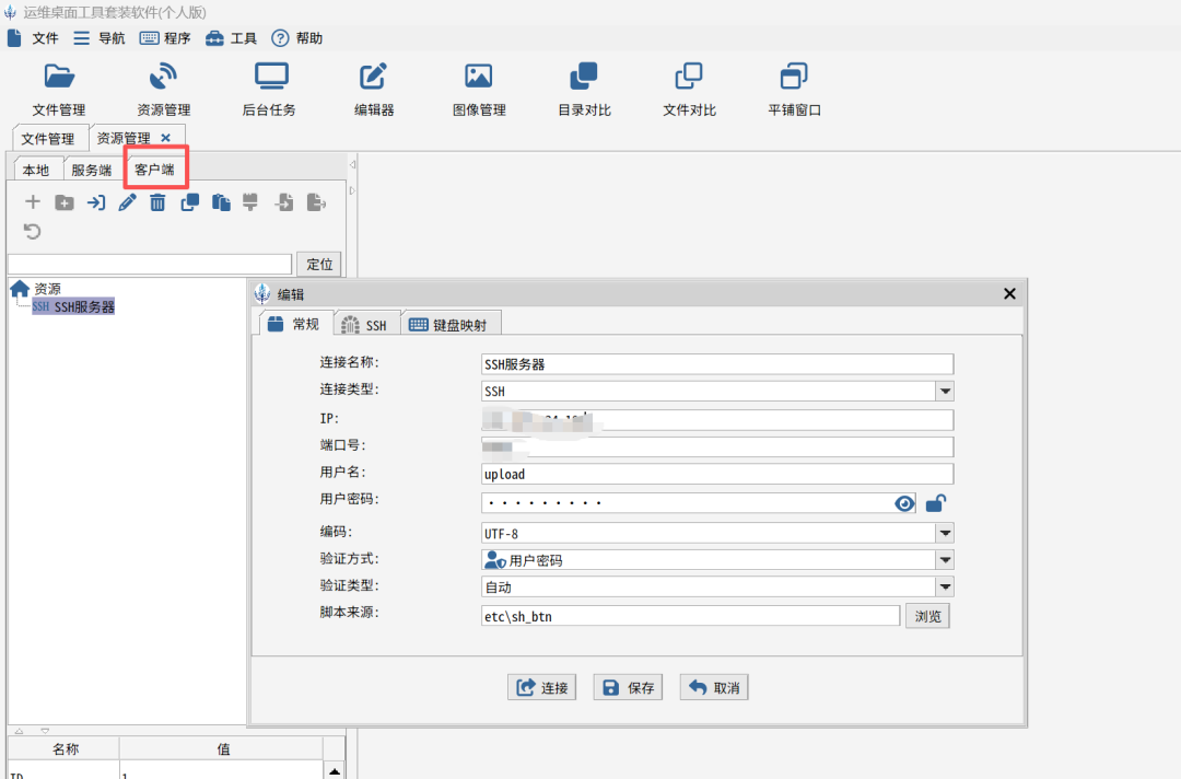 首先,在客户端资源中添加一个标准的SSH连接,如下图所示: