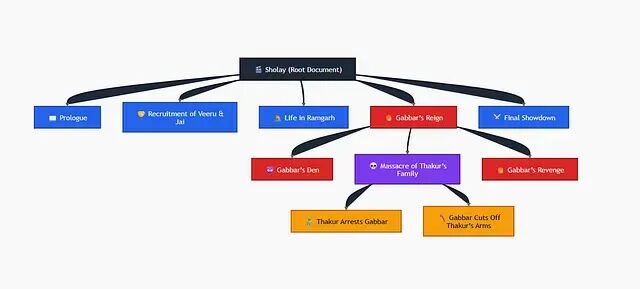 把《Sholay》的剧本或详细剧情概要输入 PageIndex,它不会将文档拆分为任意的 500 词分块,而是构建故事的结构树: