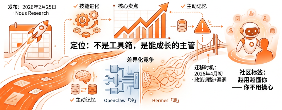 4月初,OpenClaw遭遇双重危机:Anthropic调整政策,Claude订阅额度不再覆盖第三方框架;同时曝出多个高危漏洞。Nous Research立刻推出一键迁移工具,精准承接这波迁移需求。