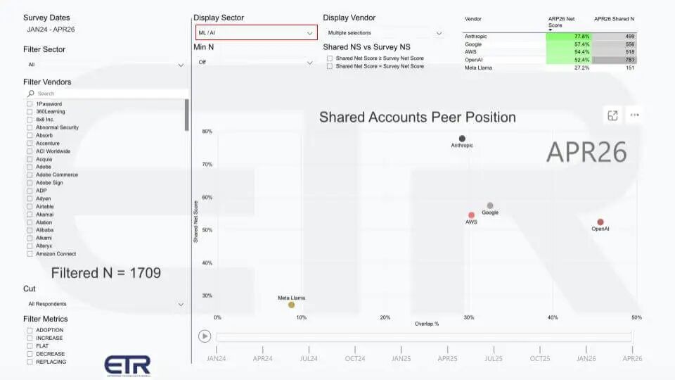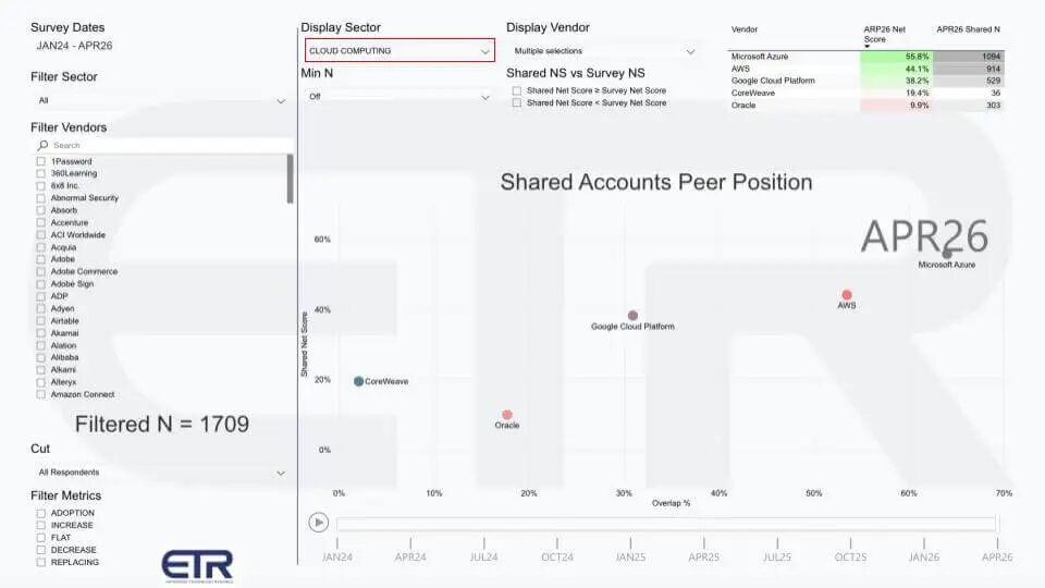 下一个 ETR 视图将谷歌云的位置置于上下文中,通过绘制两个变量。纵轴是 共享净分——ETR 在云计算部门账户中的支出势头指标。横轴是 重叠,本质上是渗透代理——每个厂商在共享账户集中的广泛出现。在此视图中,过滤 N 为 1709 账户,该图聚焦 2026 年 4 月的云计算部门。