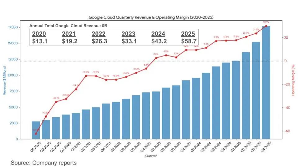 本分析其余部分的背景是,Alphabet 处于相对独特的位置。它拥有资产负债表和利润引擎来资助大规模基础设施周期,并且拥有足够大且足够改善的云业务,使其成为 AI 投资回报故事的重要部分。(国内最像Google的是哪家公司呢?)