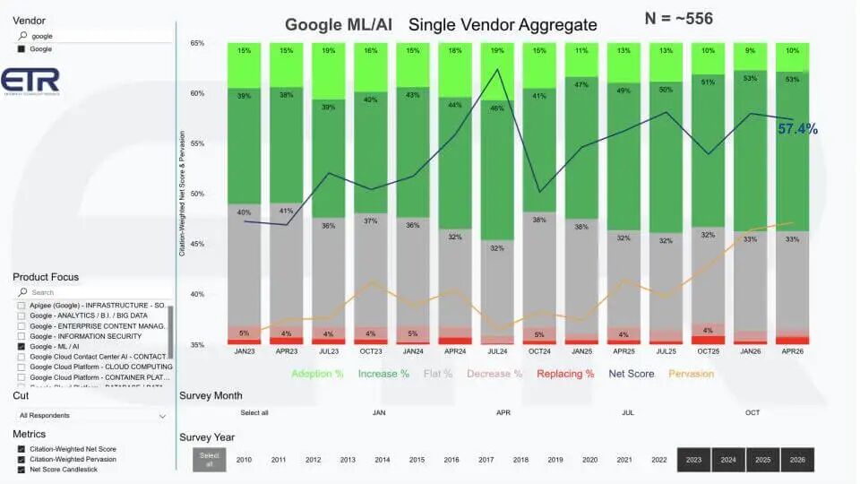 从右上角的数字开始。谷歌发布共享净分为 57.4%,共享 N 为 556。这是一个高度提升的支出势头信号,值得注意的是,谷歌在 ML/AI 中的共享 N 与先前云计算视图中的存在规模基本相同。含义是,当企业做出 AI 决策时,谷歌出现在云预算分配的相同账户的大部分中。这有助于解释为什么 AI 势头转化为云势头——采用路径通过平台运行。