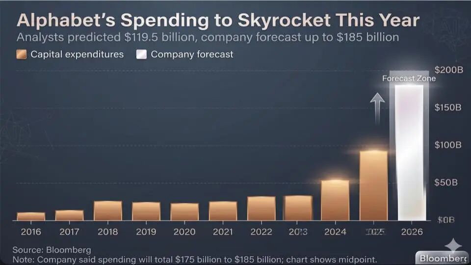 过去几个季度驱动市场的故事是超大规模云厂商的资本支出——Alphabet Inc. 现在已牢固进入这一讨论。下面的图表捕捉了谷歌的承诺。大多数分析师原本预测大约 1195 亿美元的资本支出,而 Alphabet 自身的预测披露表明今年接近 2000 亿美元。公司隐含的范围应落在 1750 亿至 1850 亿美元左右。这是一个相对于先前预期的巨大上调,将 Alphabet 2026 年的支出置于不同于投资者以往预期“正常”增长曲线的类别中。