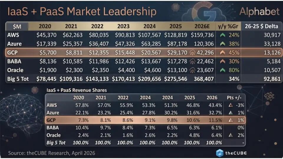 在此背景下,关键点是 GCP 在我们 2026 年估计中现在是一个 420 亿美元的 IaaS/PaaS 业务,增长率在 40% 中段。这相对于 2020 年——当时 GCP 按我们的模型是中个位数的亿美元业务——是一个重大进步。谷歌在绝对美元上仍远落后于两大领导者——AWS 预计约 1600 亿美元 和 Azure 约 1200 亿美元(2026 年)——这种规模意味着 AWS 和微软每年抛出巨额年度收入增量。右最列的增量量化了这一点,AWS 和 Azure 各增加约 310 亿至 330 亿美元的 2025 至 2026 年增量收入,而 GCP 增加约 130 亿美元。130 亿美元的年度增量收入仍是很大数字——但两大领导者由于安装基数的规模而难以追赶。