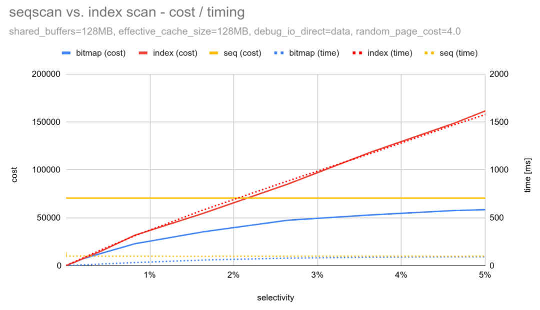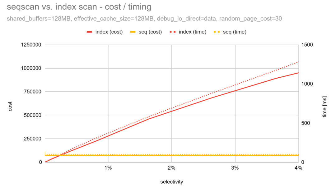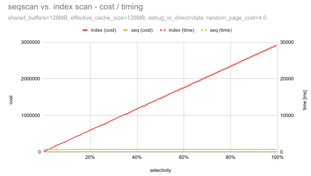 成本(实线)在约2.2%处相交,此时规划器切换为顺序扫描。而耗时(虚线)则在0.2%处相交,此时顺序扫描的速度更快。