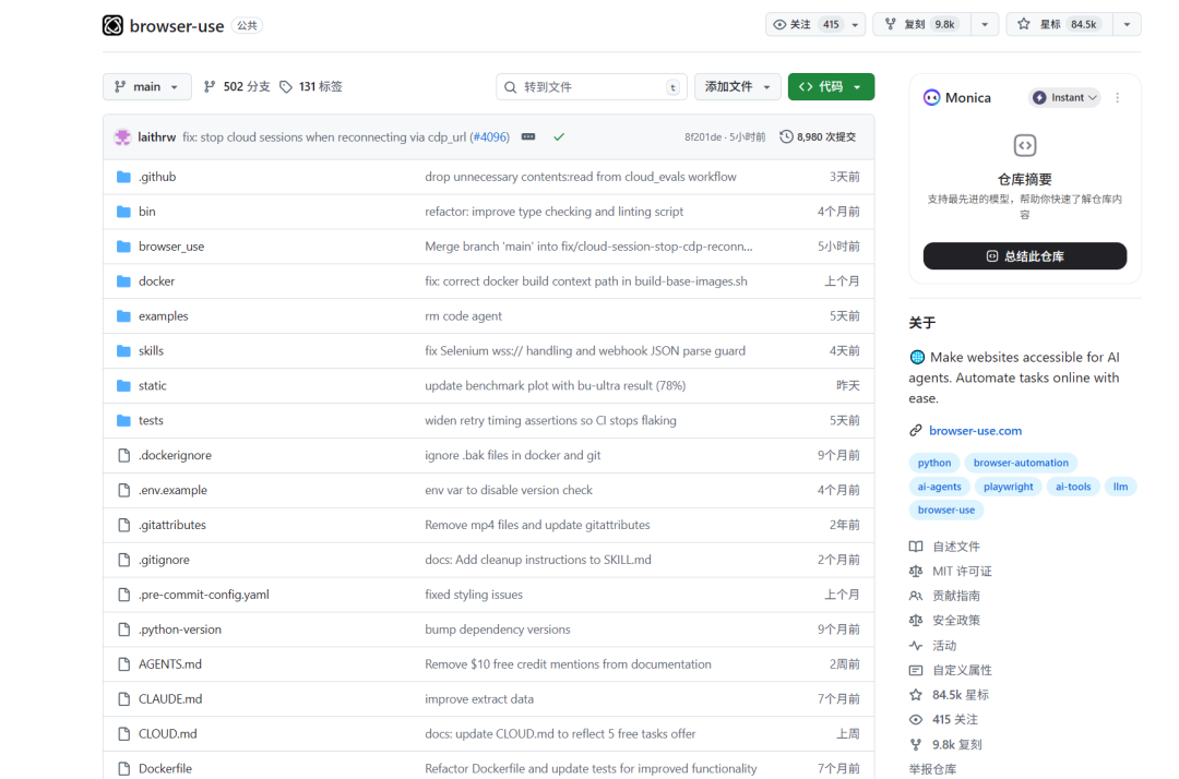 今天给大家推荐一款GitHub近85k+ star的AI神器——browser-use,它彻底打破了传统浏览器自动化的壁垒,无需编写一行代码,仅用自然语言就能操控浏览器完成各类测试任务,让测试自动化变得人人可上手,大幅释放测试人员的时间和精力,聚焦核心的问题定位与分析。