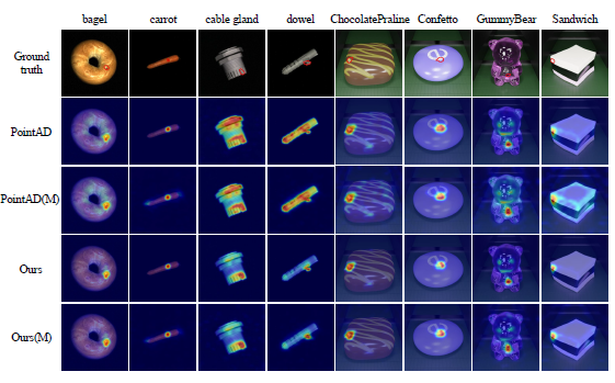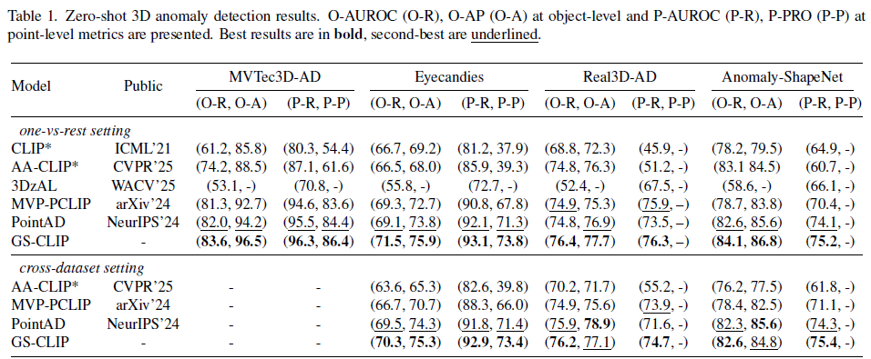 研究在四个大规模公开数据集上进行了评估:MVTec3D-AD(真实工业级)、Real3D-AD(真实工业级)、Eyecandies(合成)、Anomaly-ShapeNet(合成)。采用两种零样本设置:留一验证(在三个选定类别上独立训练)和跨数据集验证(使用单一类别作为辅助训练数据,在其他数据集上测试)。