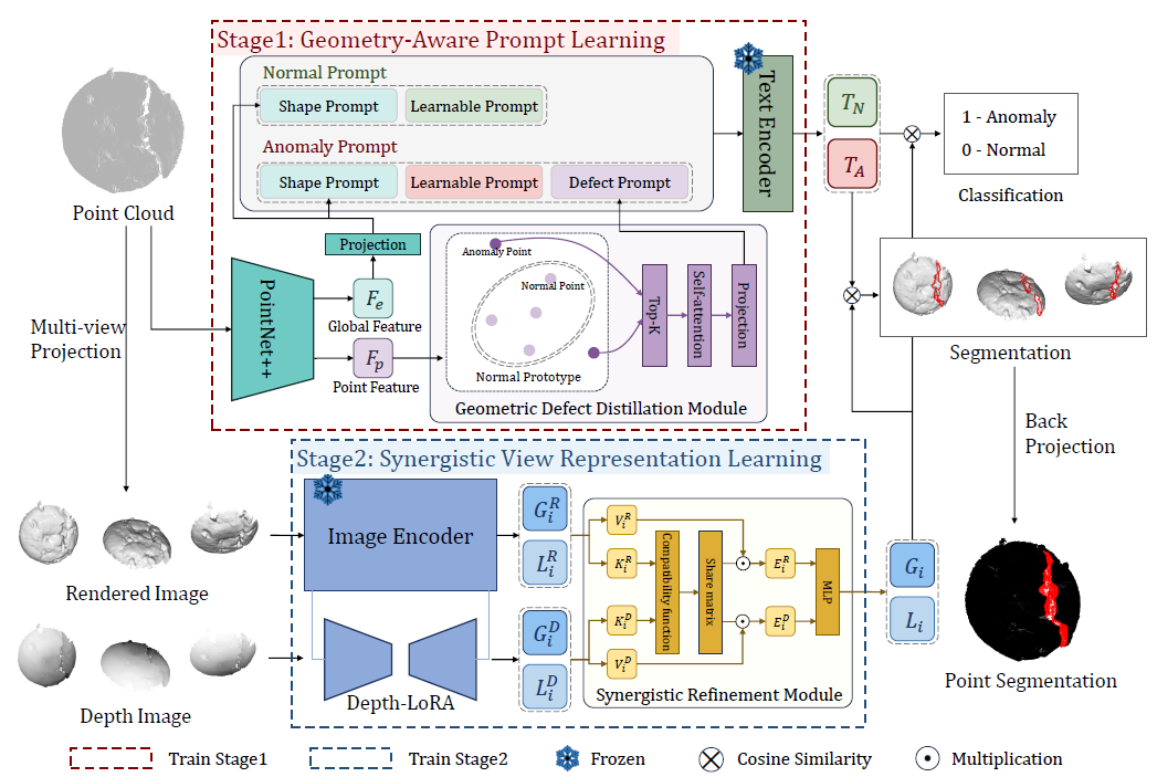 第一阶段:几何感知提示学习(Geometry-Aware Prompt Learning)。在冻结视觉组件的情况下,训练一个文本提示生成器。该生成器通过提取3D点云的全局几何信息动态创建形状提示,并通过设计的几何缺陷蒸馏模块(Geometric Defect Distillation Module, GDDM)从局部几何特征中识别并合成缺陷信息。这些嵌入了3D结构先验的文本提示为从2D投影图像中检测和定位异常提供了关键线索。