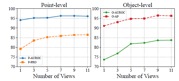 随着视角数量增加,性能整体上升,约9个视角时达到饱和。