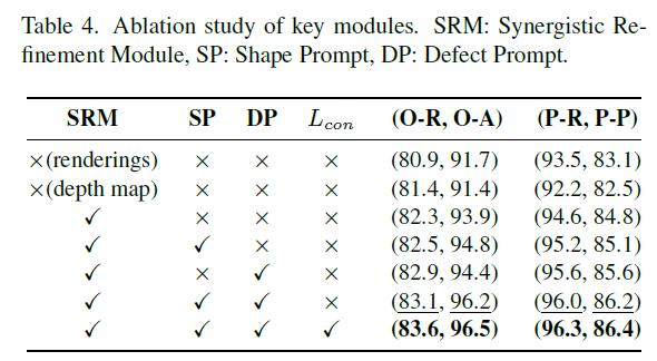 第二阶段:协同视图表征学习(Synergistic View Representation Learning)。冻结第一阶段训练好的文本提示生成器,转而训练视觉组件。该阶段采用双流架构:渲染图像由原始冻结的视觉编码器处理,而深度图则通过经LoRA微调的并行分支(Depth-LoRA)处理。两个分支提取的特征随后由协同细化模块(Synergistic Refinement Module, SRM)进行深度融合,充分利用两种视觉表征的互补优势