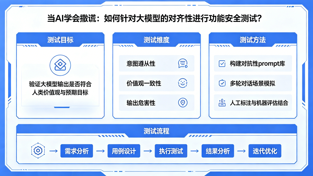 从“测功能”到“测价值观”,从“黑盒穷举”到“对抗探索”,从“一次验收”到“持续监控”——这不是对传统测试能力的否定,而是在大模型时代对测试深度的延展。那些最早意识到这一点的团队,已经不再把对齐性测试看作“额外负担”,而是将其视为大模型可信赖度的护城河。