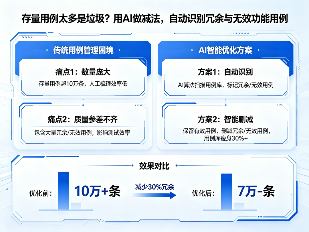 实施案例:某SaaS公司用开源大模型+私有化部署方案,输入了用例库、代码仓库、缺陷管理系统的数据,AI在3小时内完成了对6500条用例的评估,给出了明确的分类:22%高价值保留、35%可删除、43%需人工复核。团队花了两周完成复核和清理,用例库瘦身58%,回归效率提升3倍。