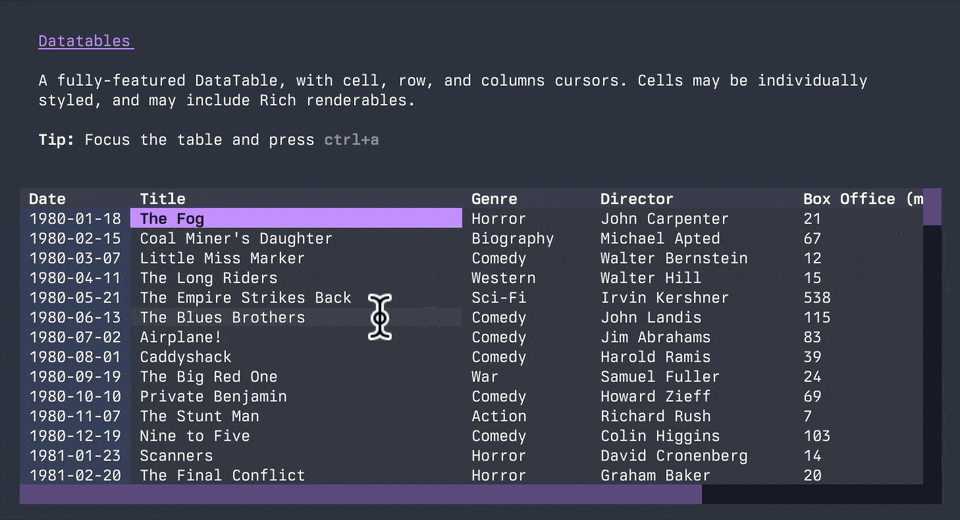 但如果你正准备写个数据库管理工具、本地文件搜索器,或者就是一个想让自己用着舒服的运维看板,Textual 可以说是目前平衡“开发成本”和“视觉效果”的最佳方案。它的跨平台支持也很好,只要有终端的地方(哪怕是你 SSH 连上的远程服务器),就能稳稳地跑起来。
