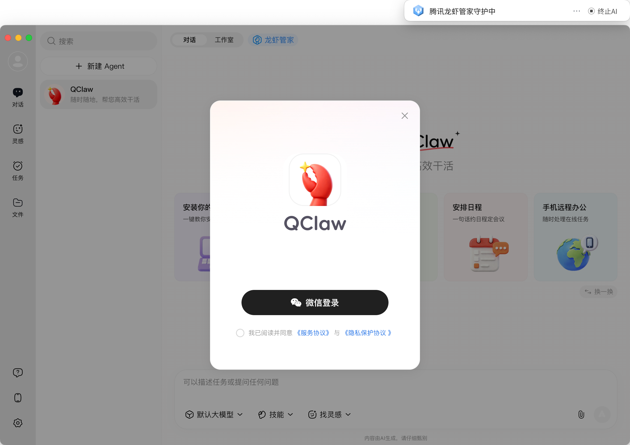 可以看到右上角有「腾讯龙虾管家守护中」的提示