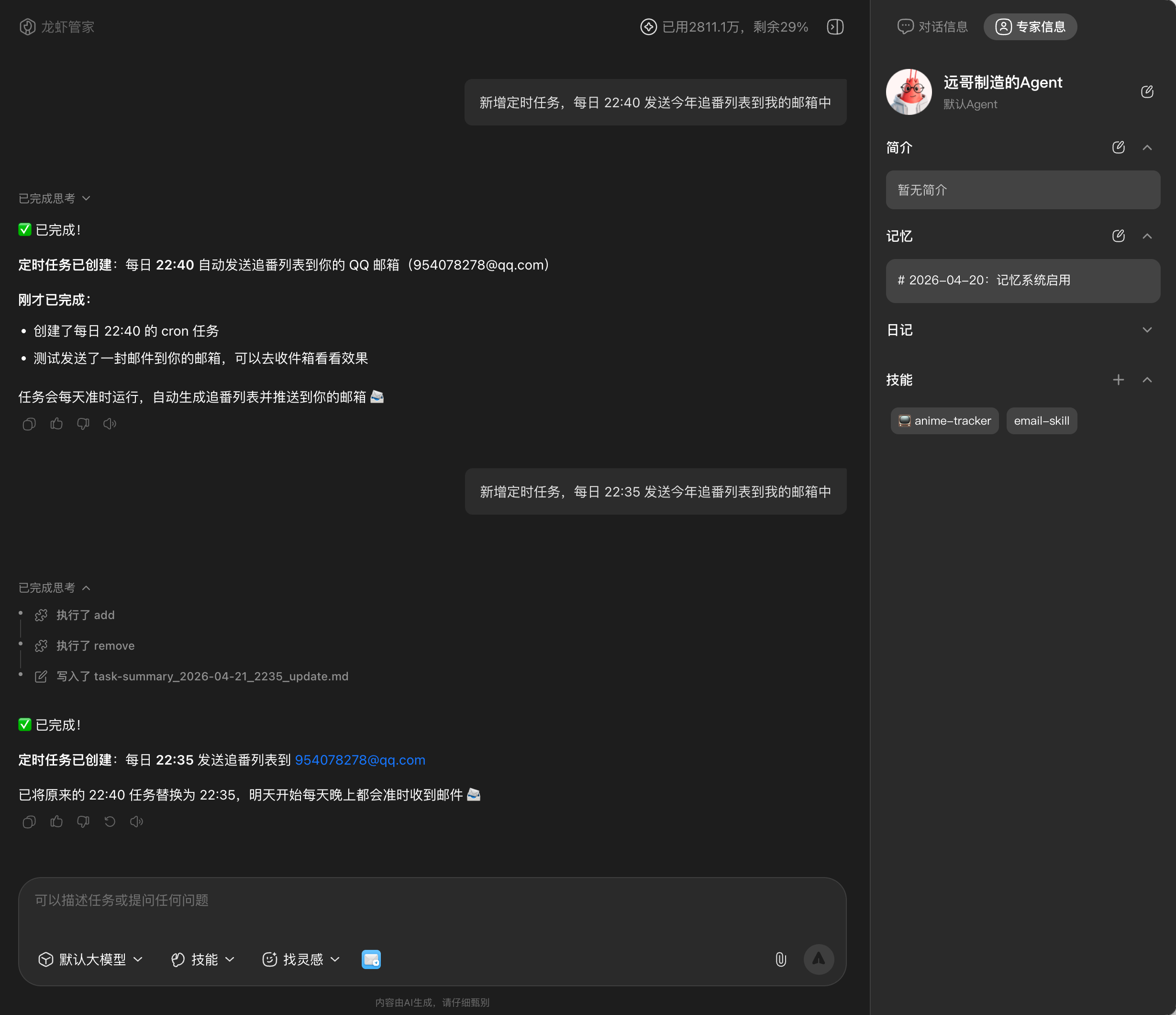 实测可以成功通过与 Agent 对话实现收到测试邮件