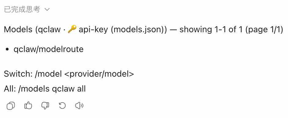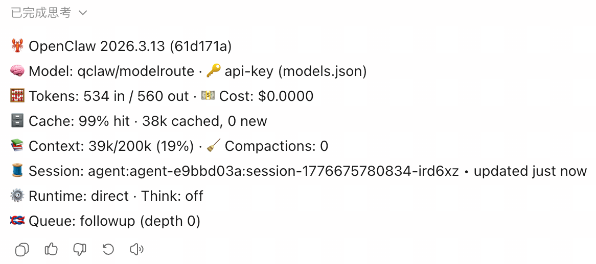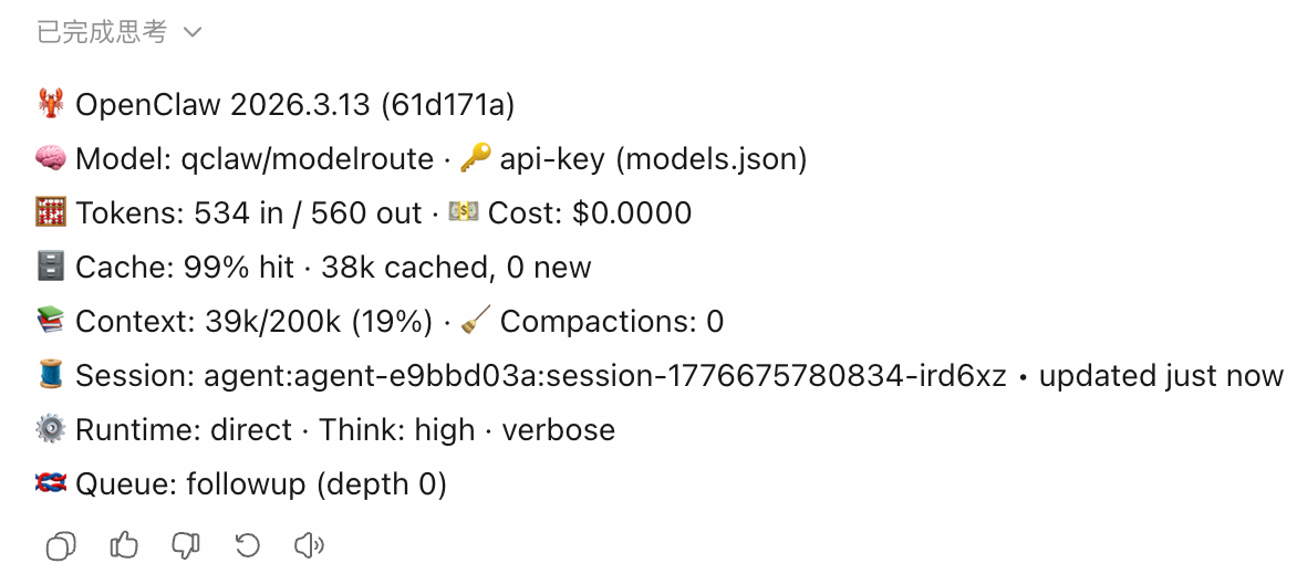 当前配置的模型是 qclaw/modelroute,因为是通过本地的 Auth Gateway 代理访问 JPRx,所以并不知道具体的 model 是什么