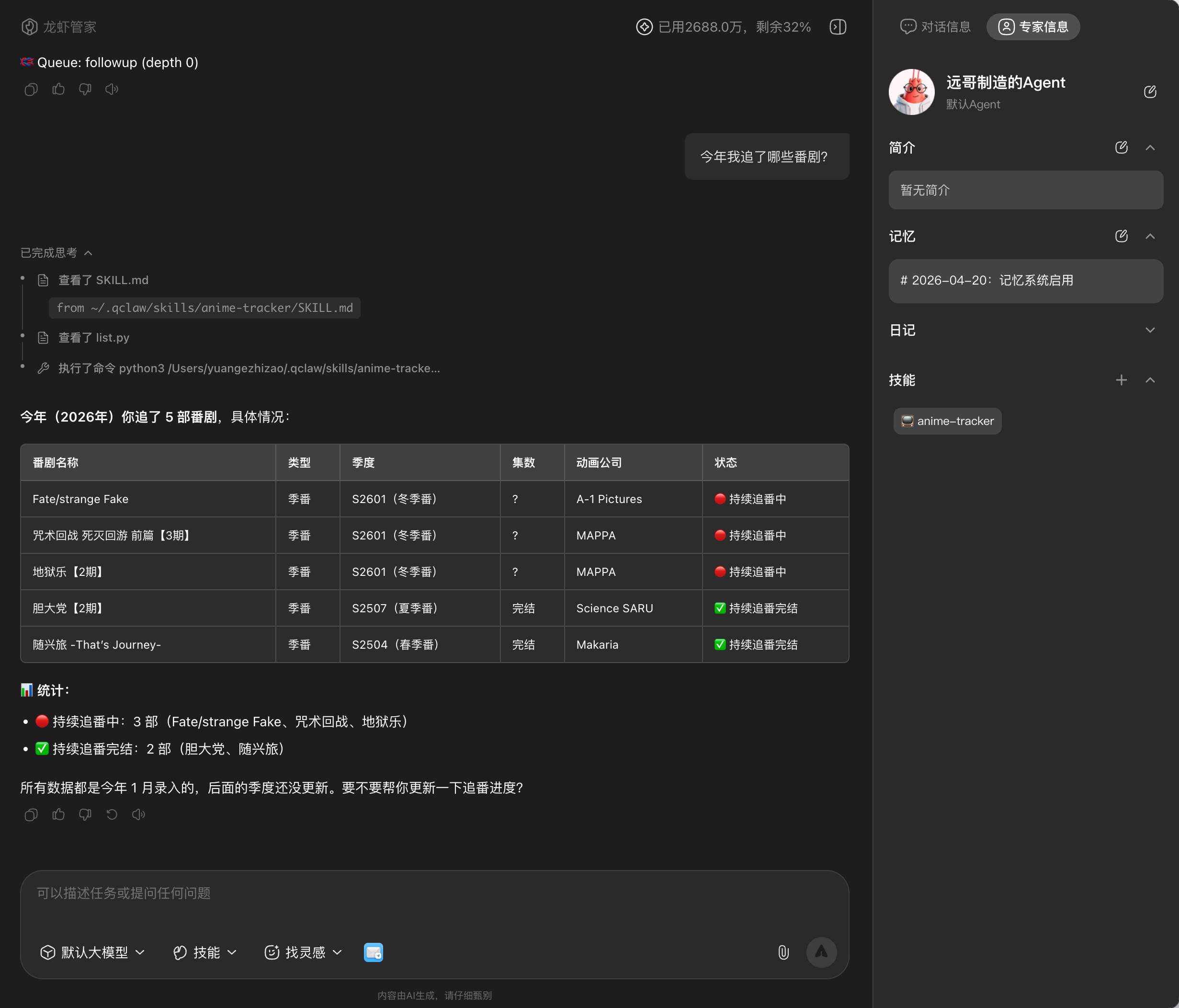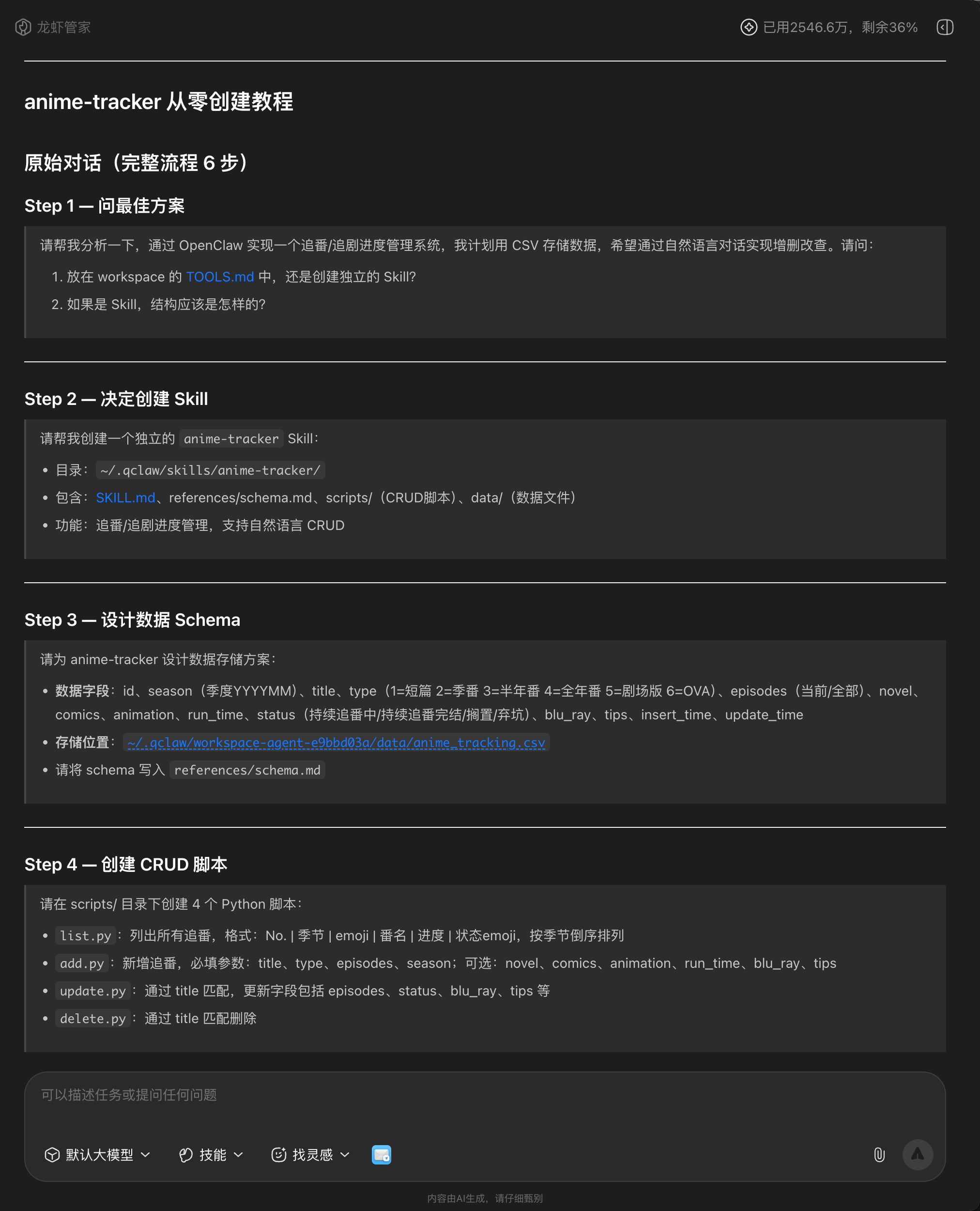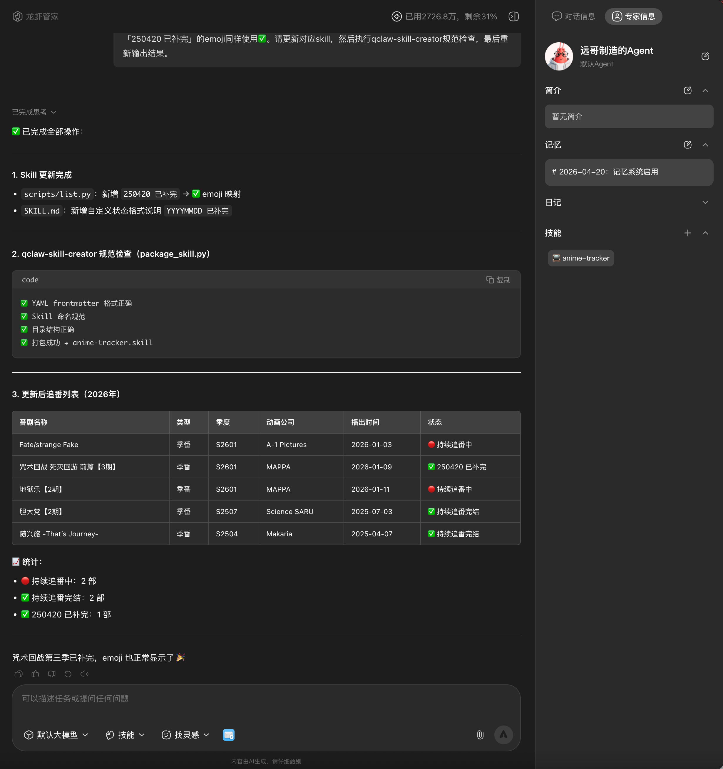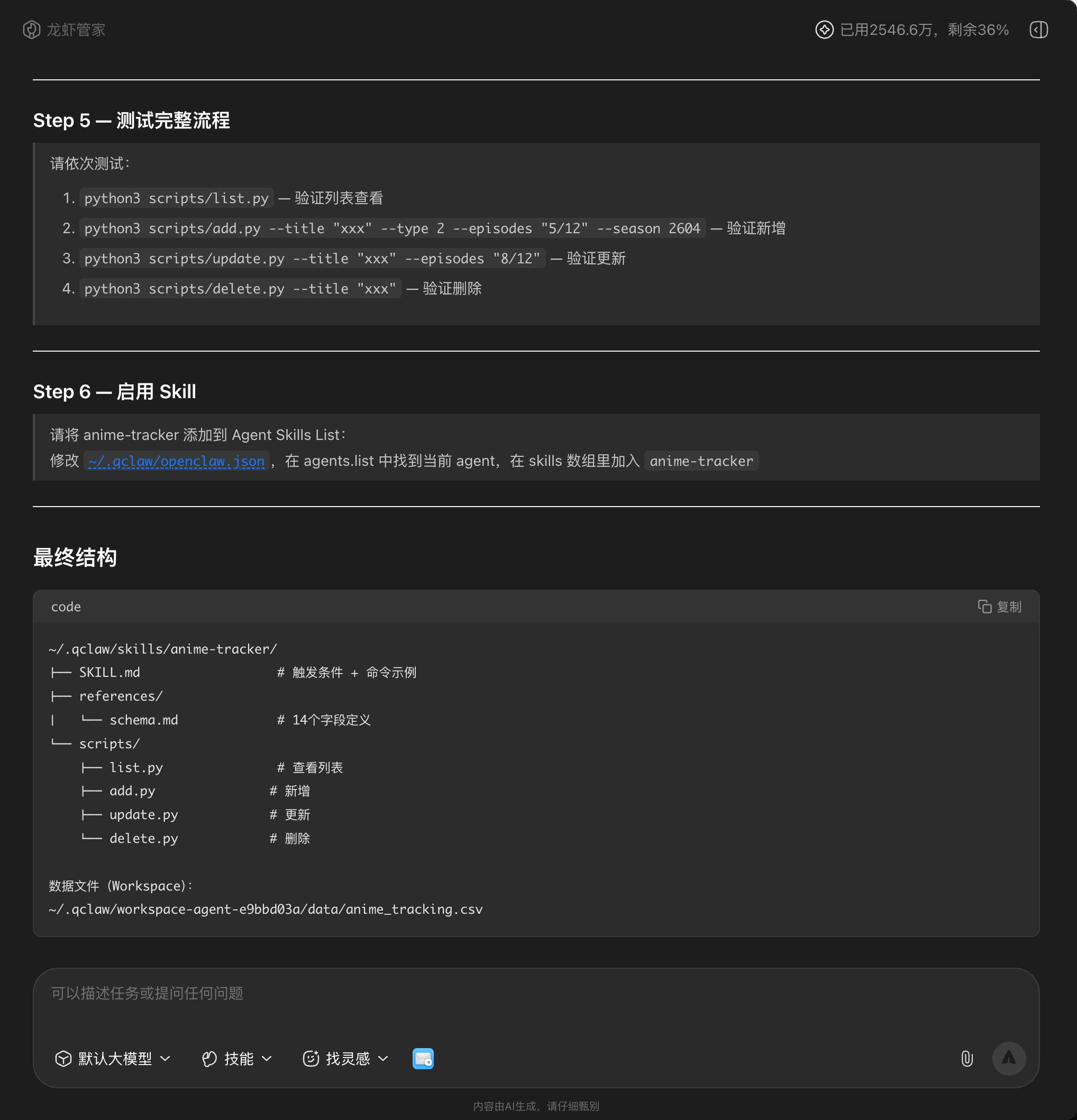 想使用 QClaw 实现管理追番进度的这个功能,最合适的就是创建 skill 了