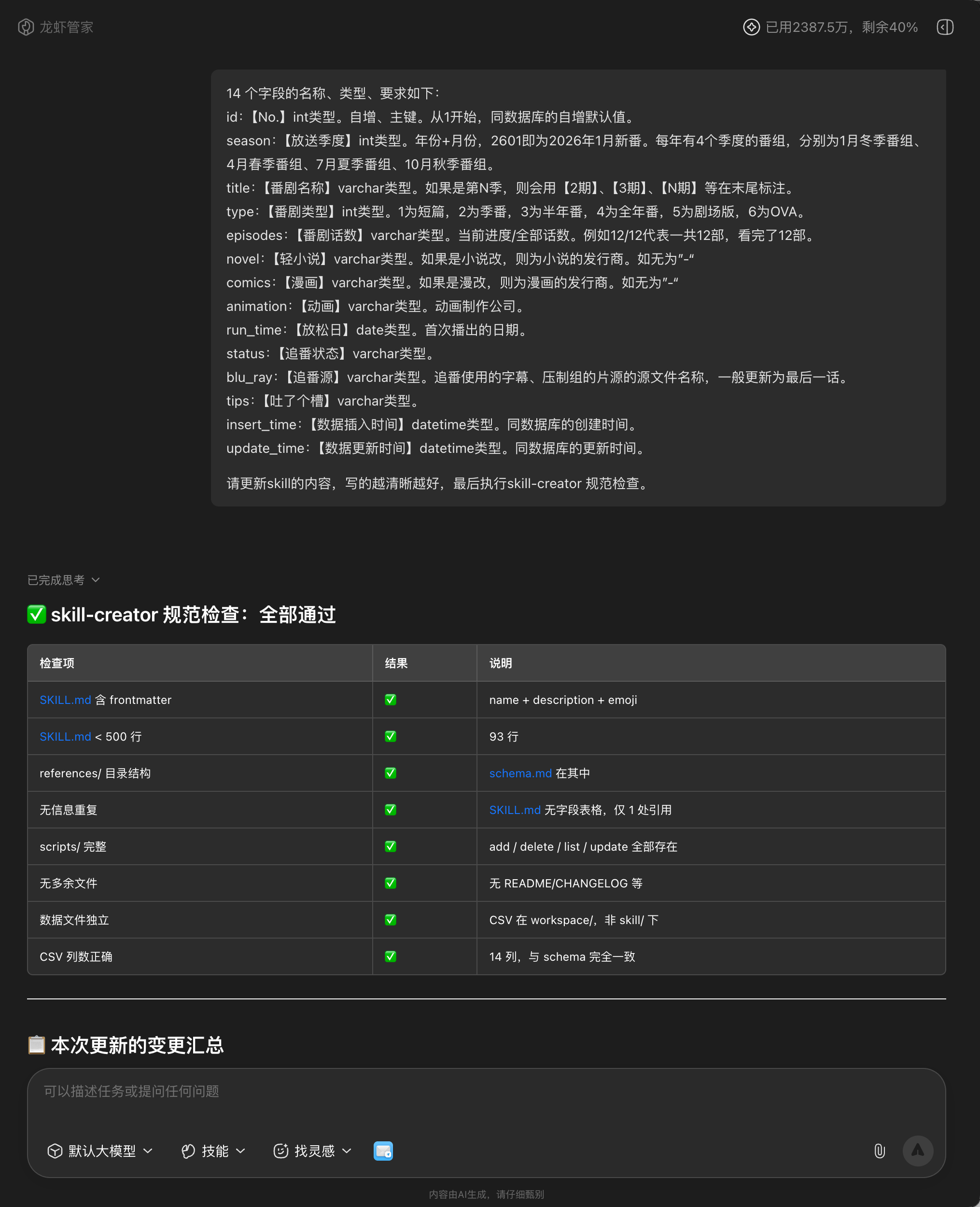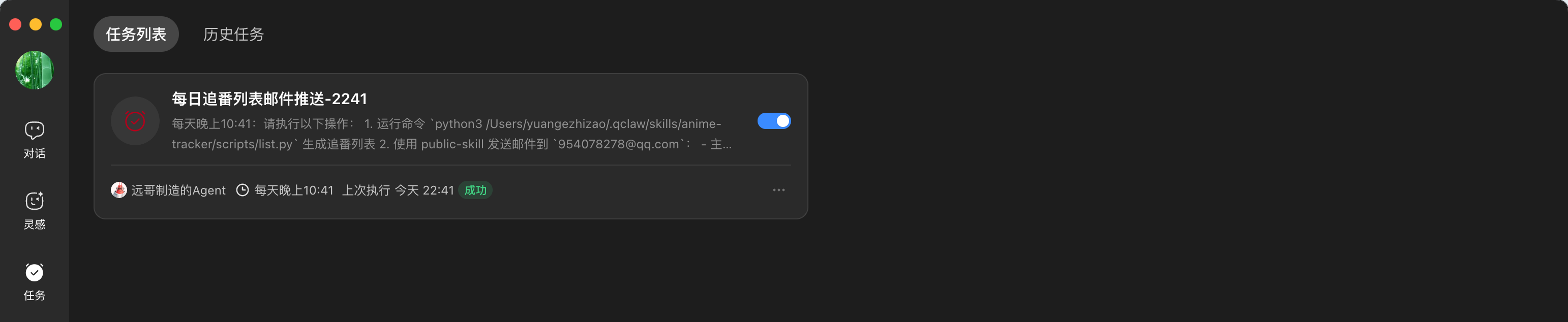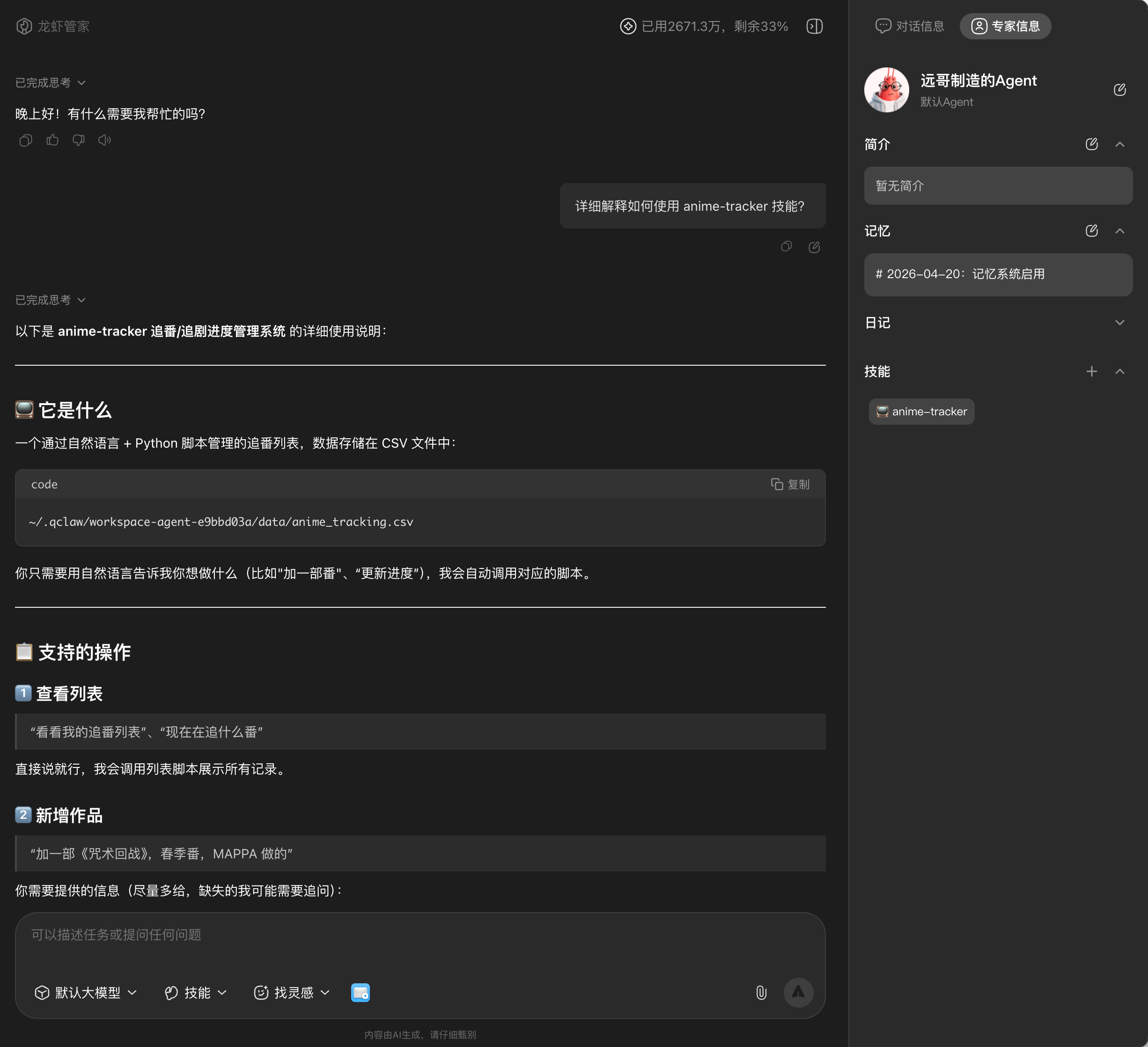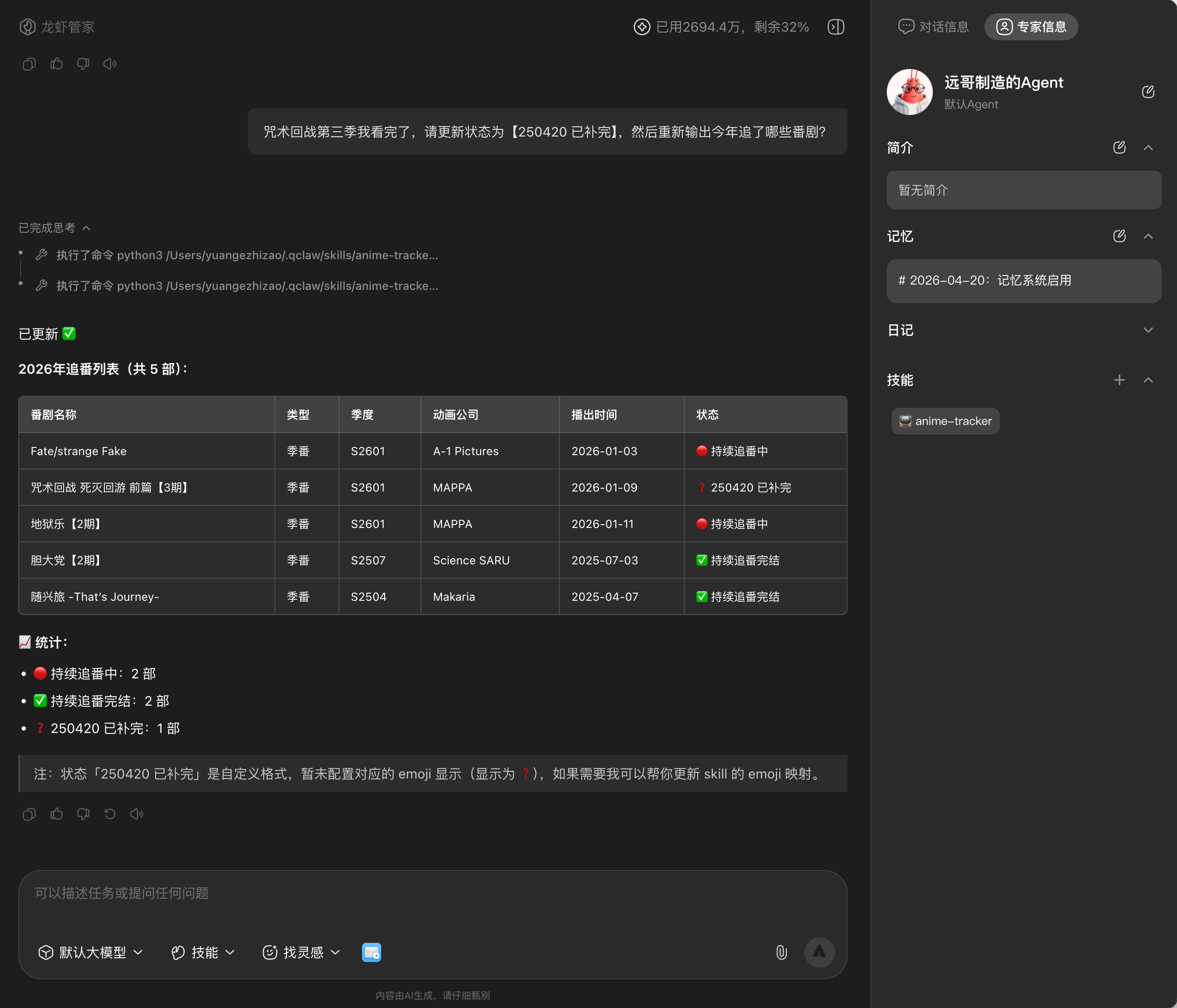 想使用 QClaw 实现管理追番进度的这个功能,最合适的就是创建 skill 了