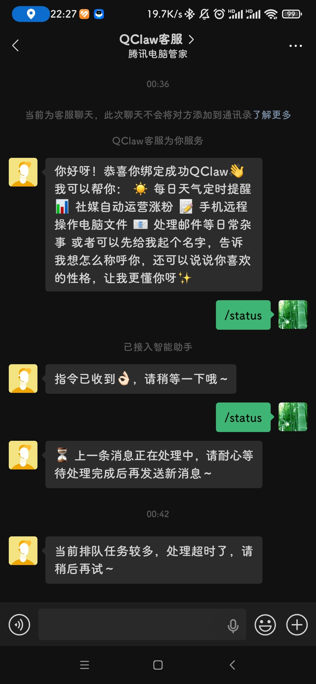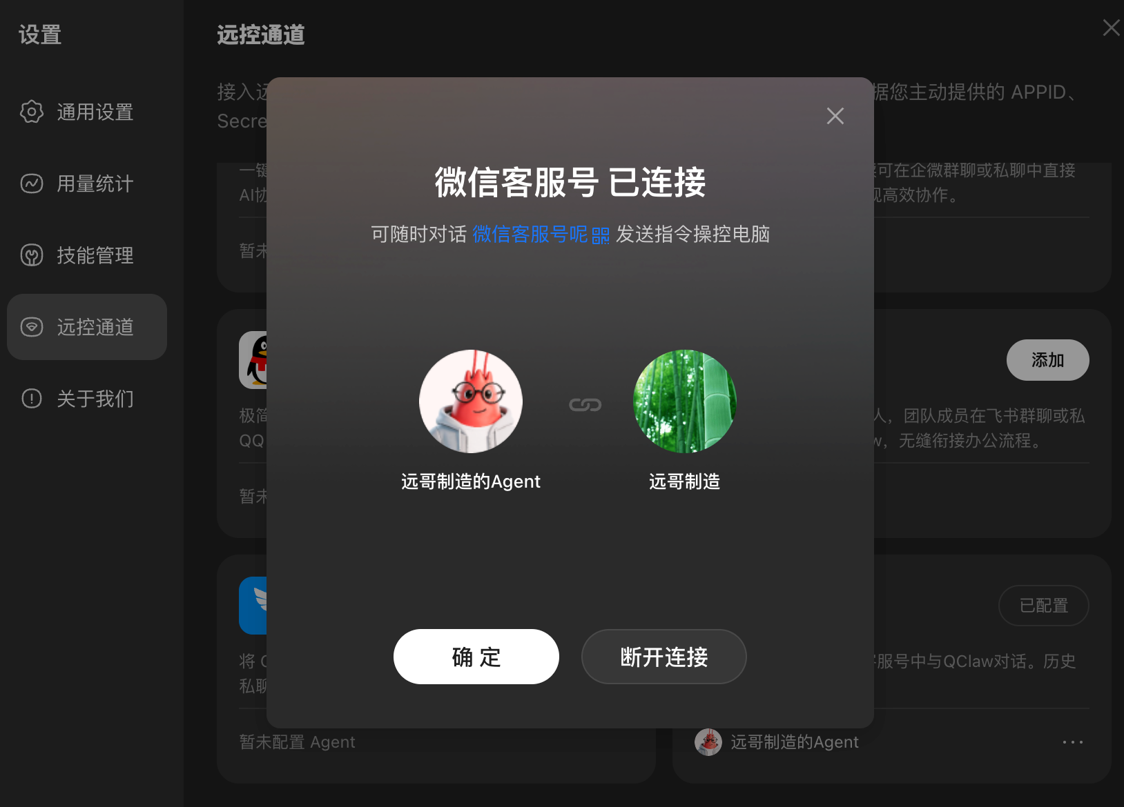 扫码连接,然后就可以在微信客服号的窗口和 QClaw 进行对话了