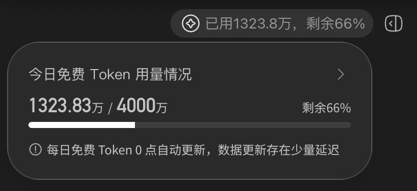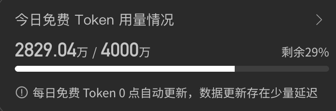 「用量统计」中可以看到,目前每日赠送了 4KW 的 Token 额度(比页面刷新前一闪而过的 2KW 翻了一倍)