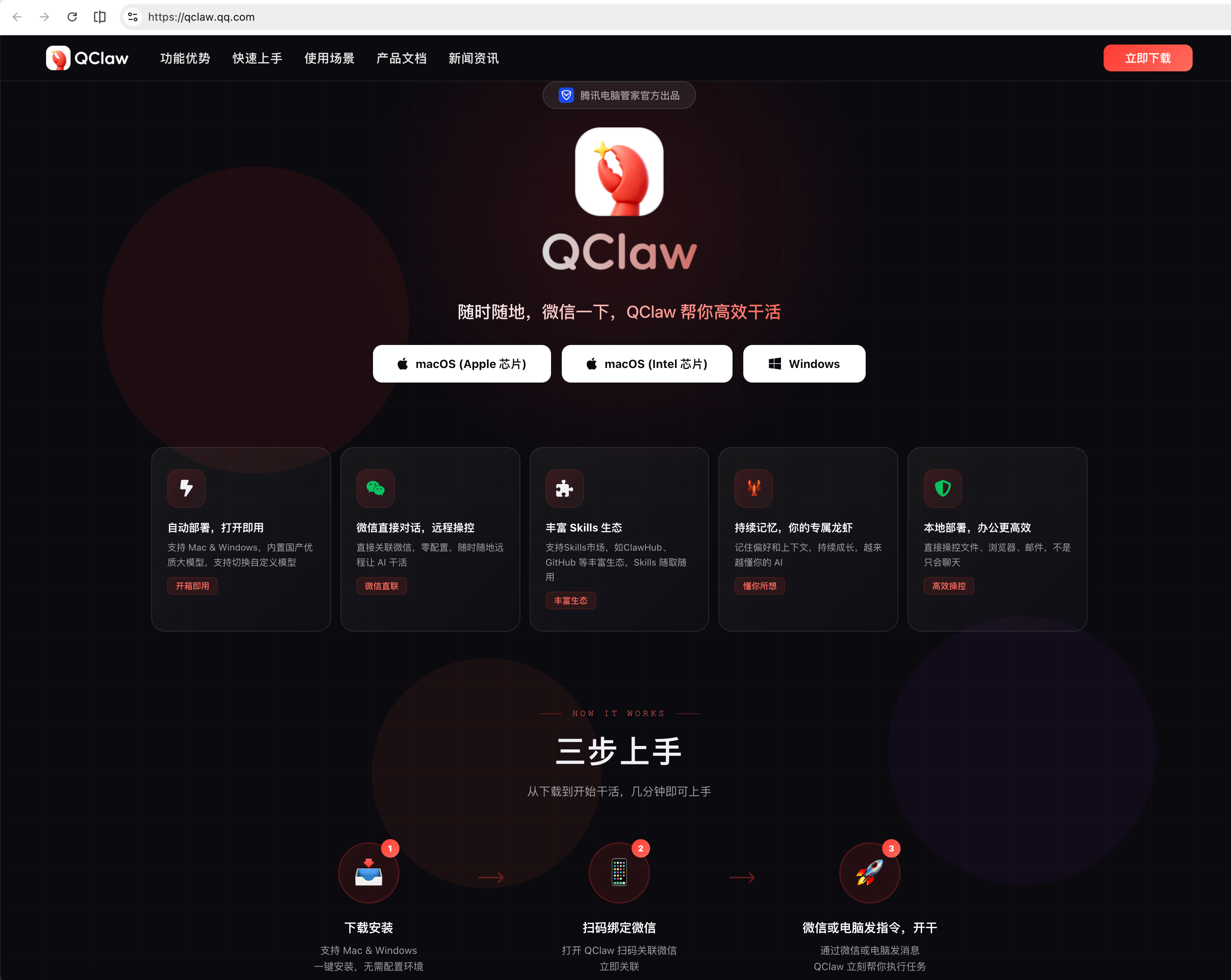 官网:https://qclaw.qq.com,可以下载 PC 版的客户端