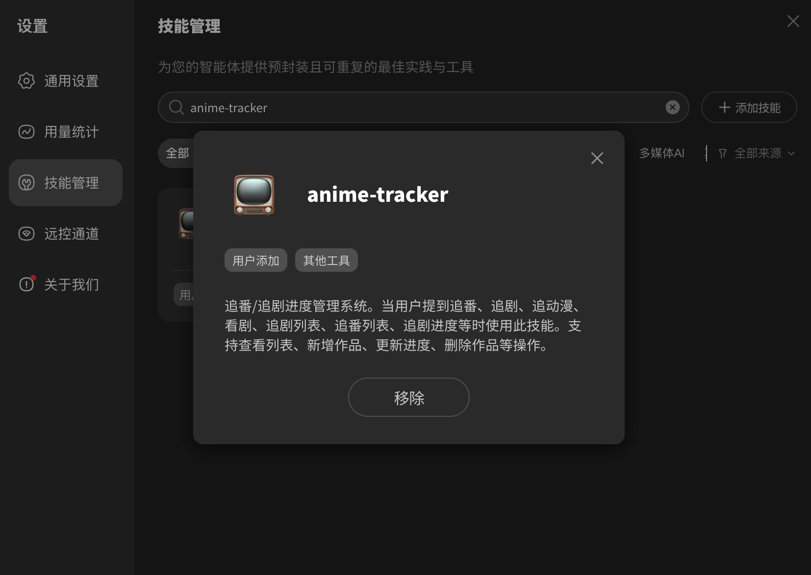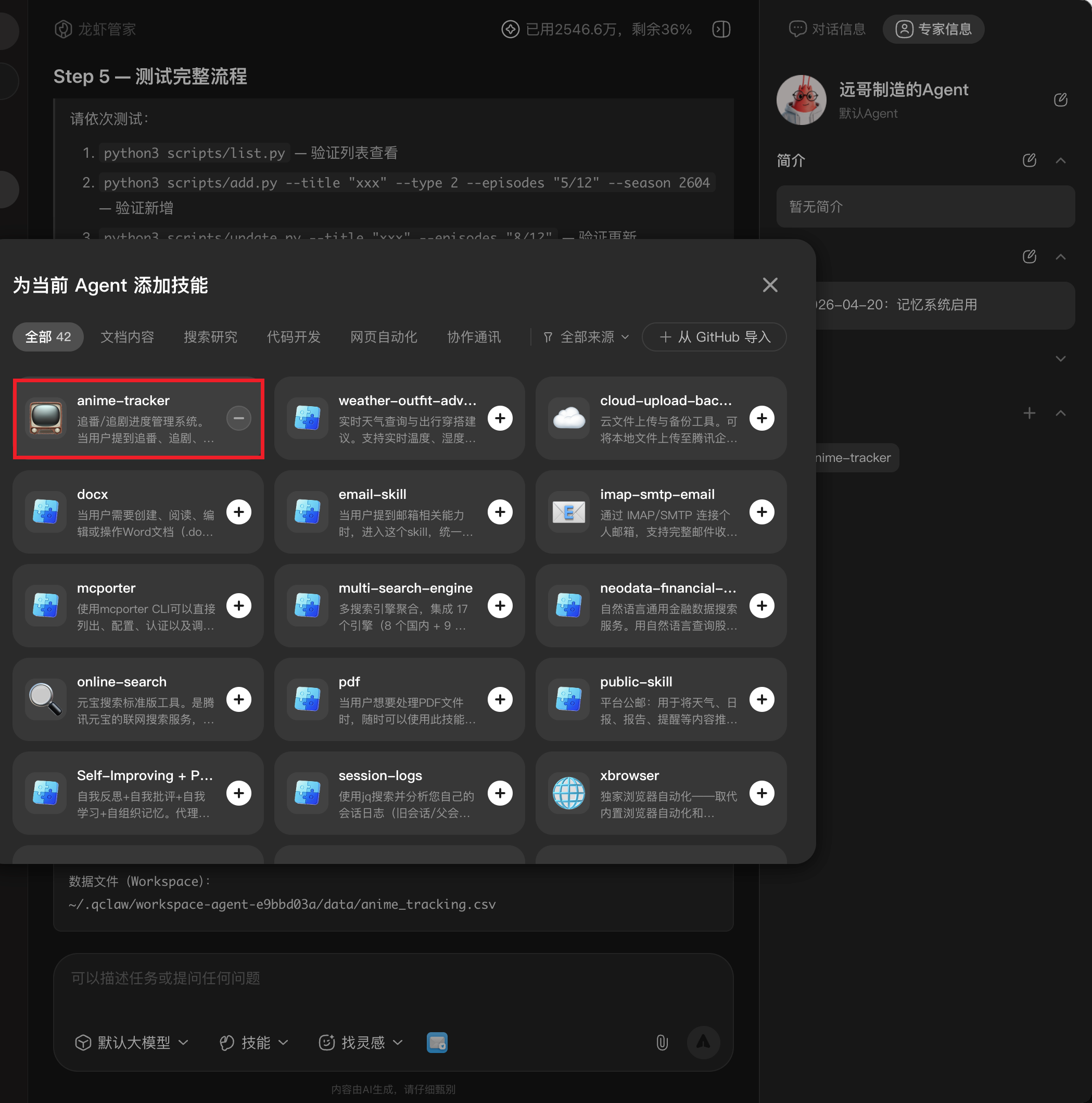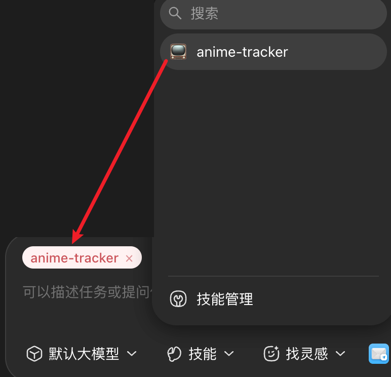 回到工作区,在右边栏【勾选为当前 Agent 添加技能】,然后选择新创建的 anime-tracker,这样就算在本工作区启用了