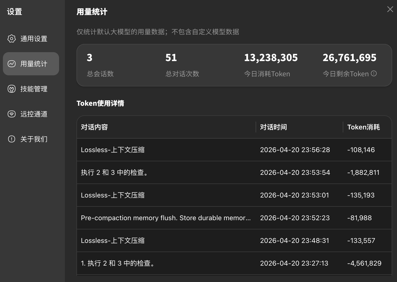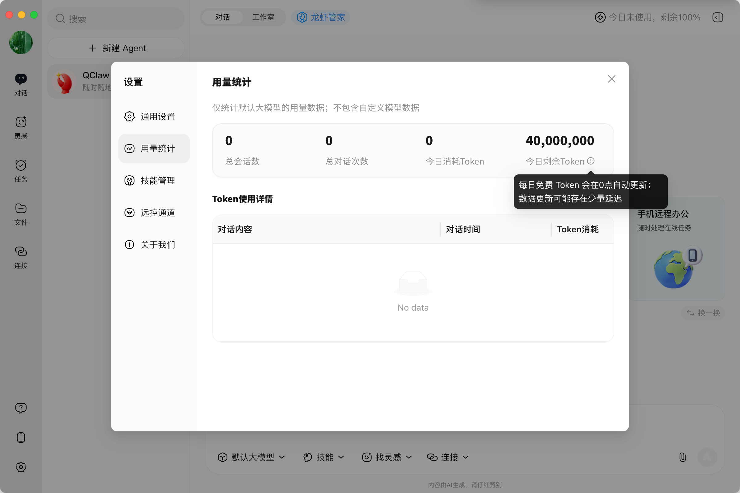 自己写这篇文章时与 Agent 高强度聊天时 Token 是足够的,主要看执行的任务的复杂度,实测第一天剩余 50%+