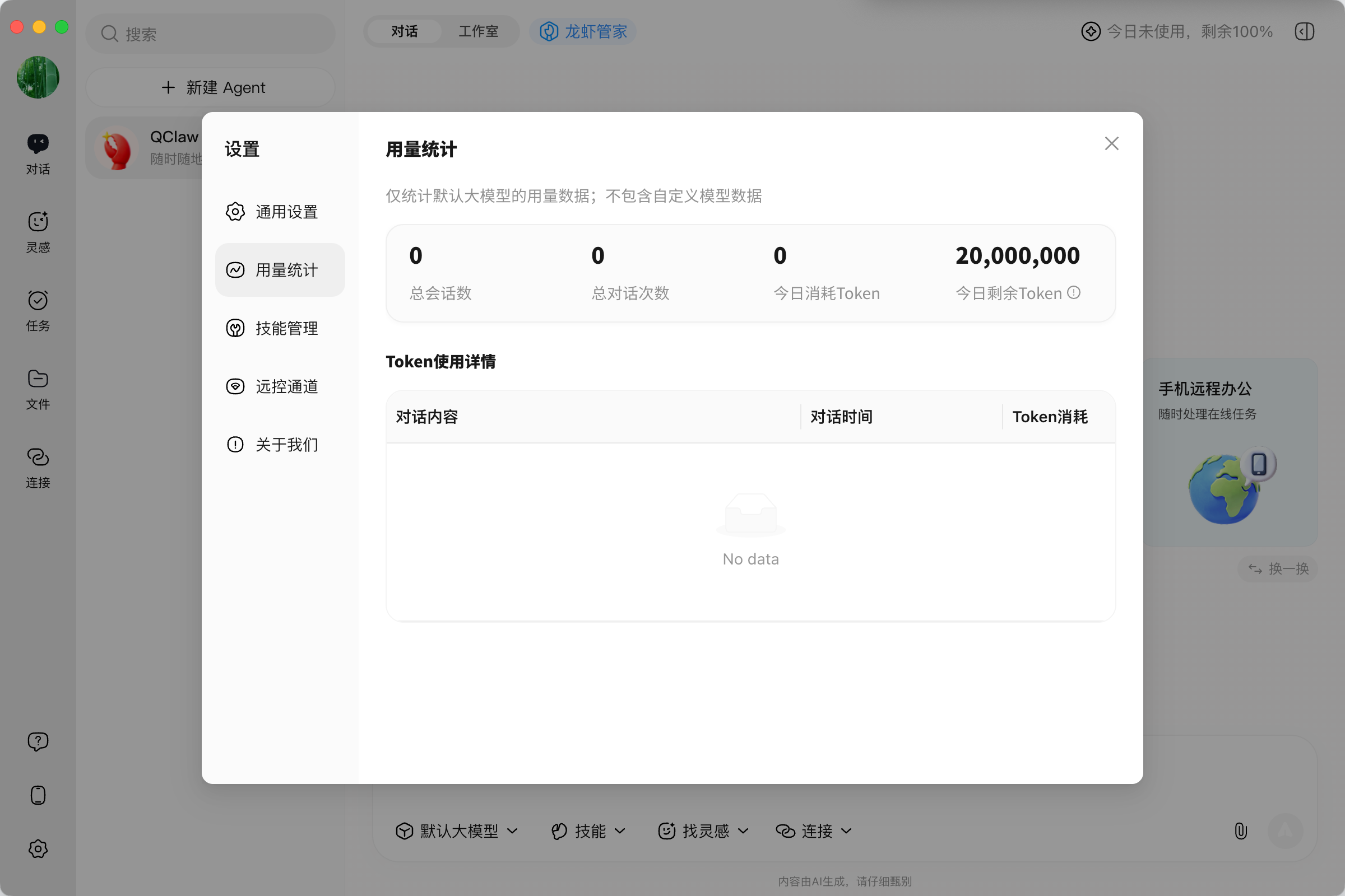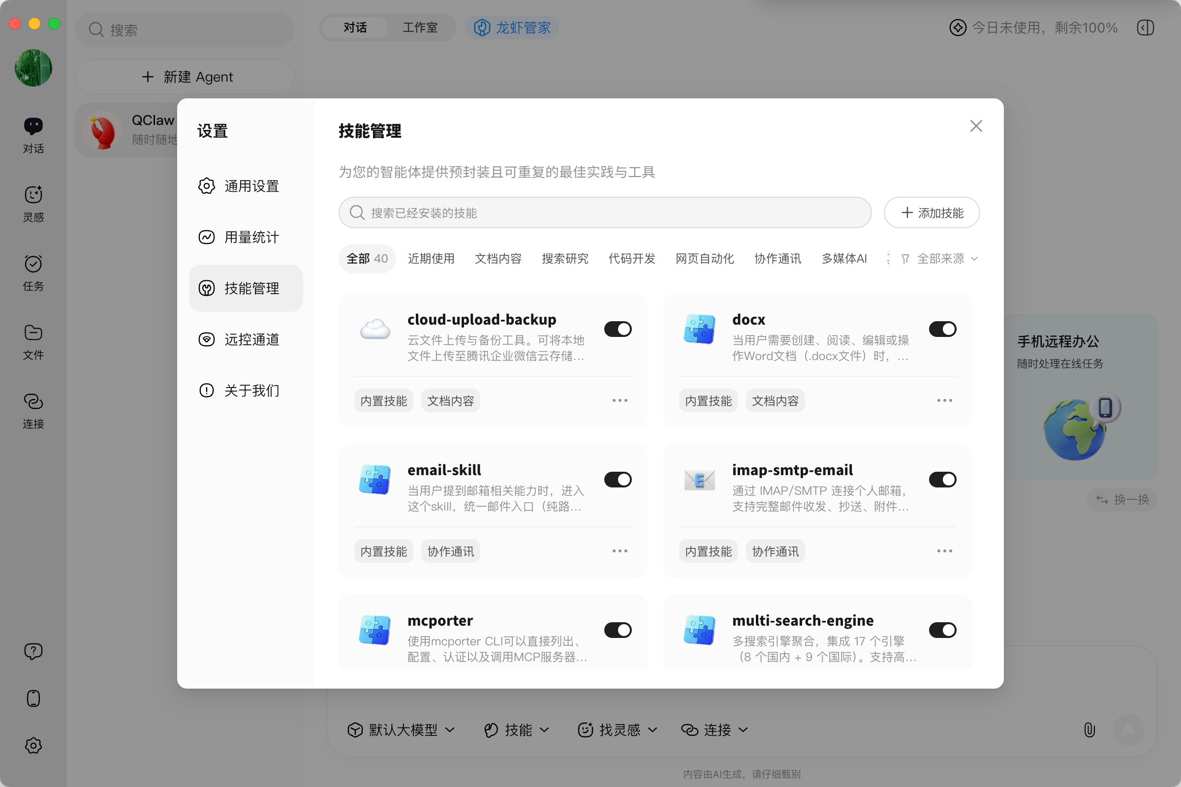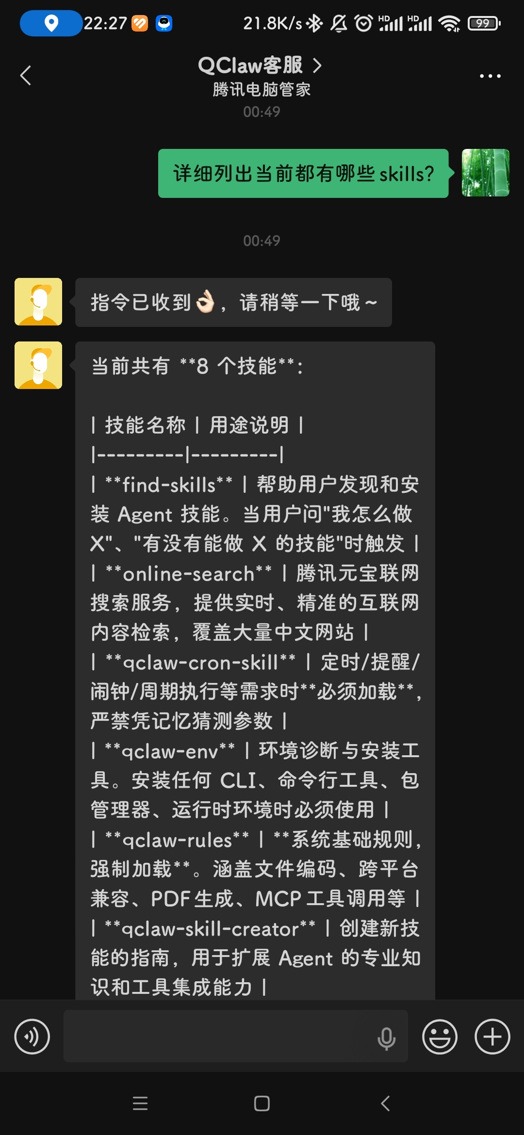 这里实测即使不主动在对话框中勾选技能,只要工作区开启了,QClaw 也是可以正常调用的