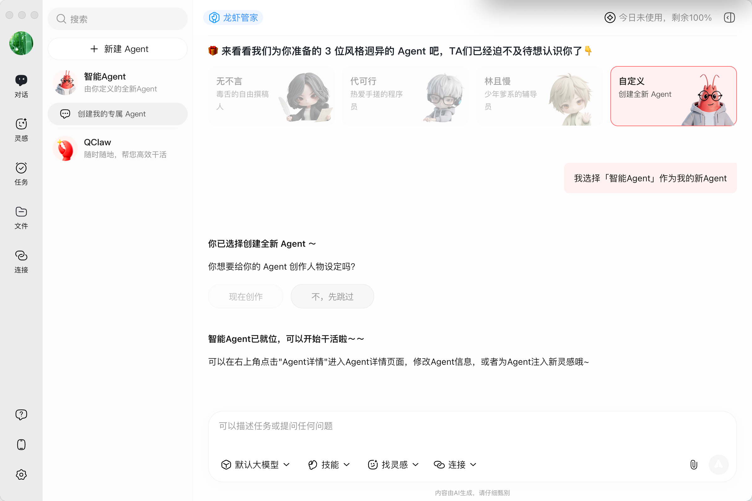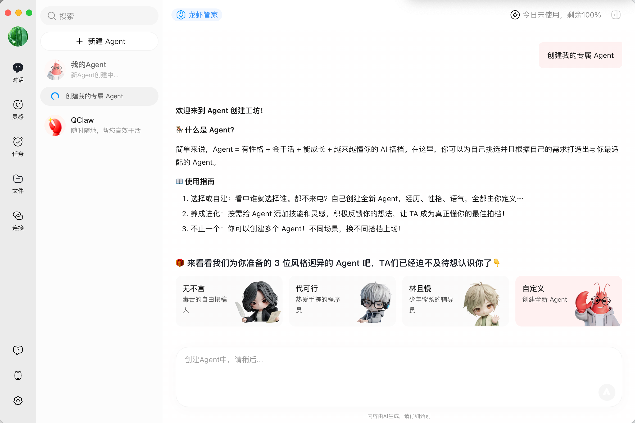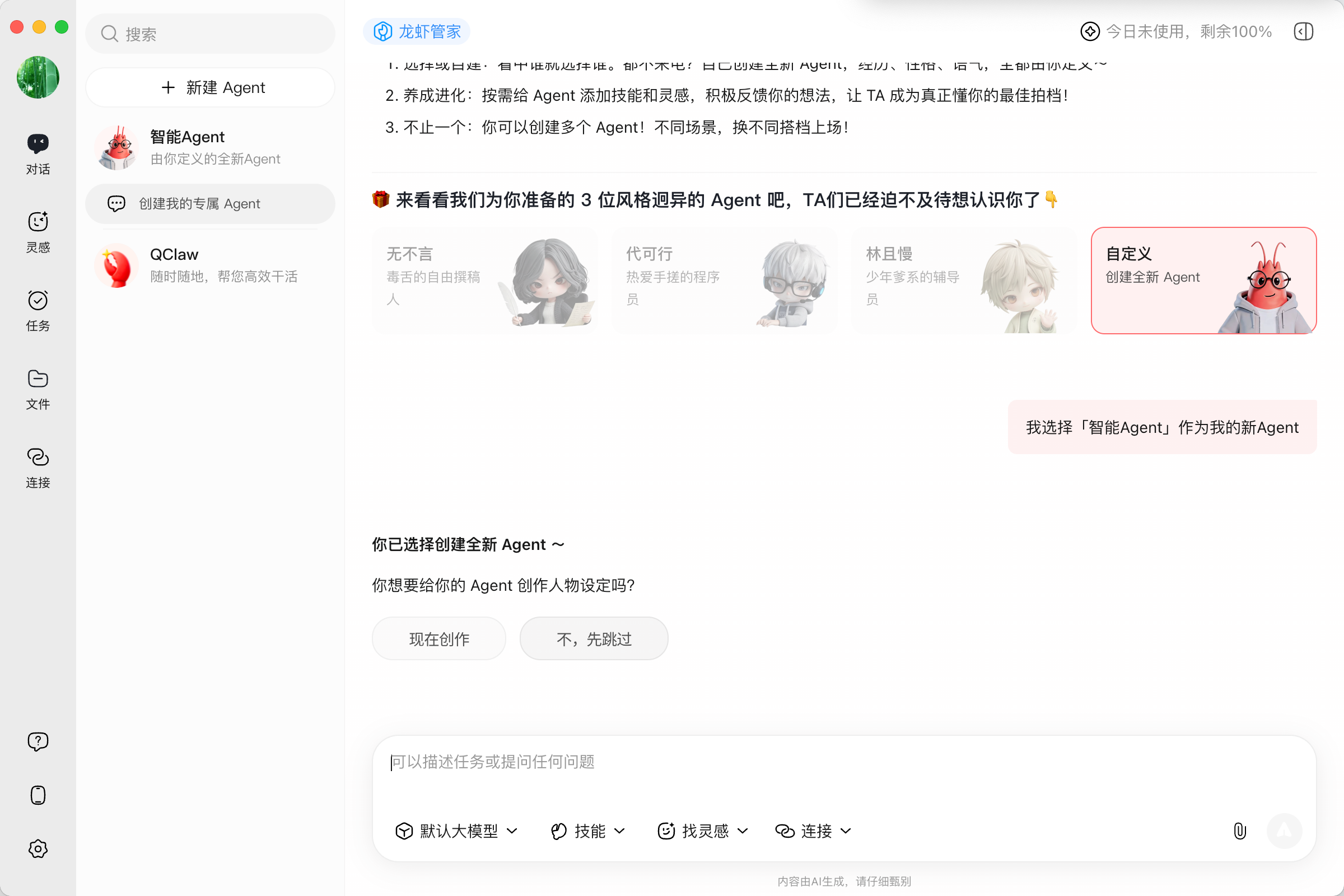 这里为了将不同功能的 Agent 独立开,选择「新建 Agent」,不在默认的「QClaw」上聊天