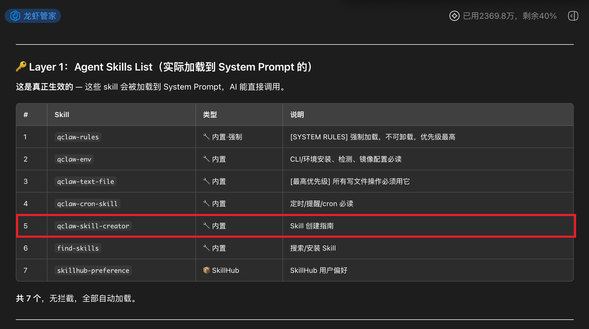 因为 QClaw 自带 qclaw-skill-creator 的 skill,因此我们可以通过自然语言创建,而不用手写 skill 文件夹中的任何文件