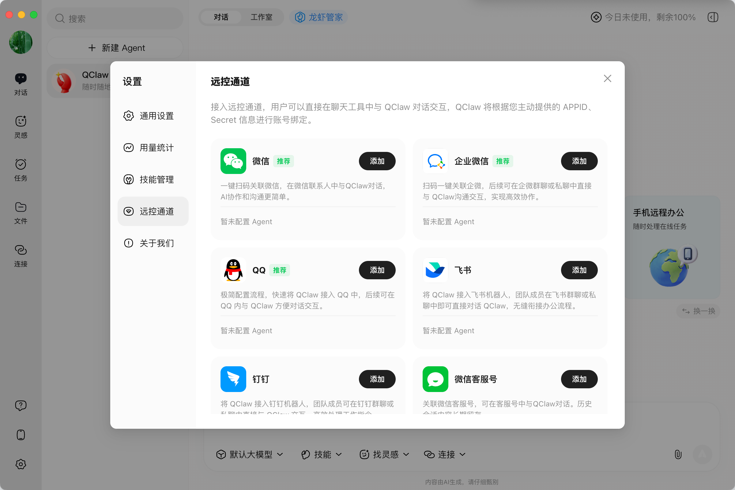 「远控通道」中 channels(消息渠道)支持 6 种,添加之后就可以通过以下渠道和 QClaw 聊天了