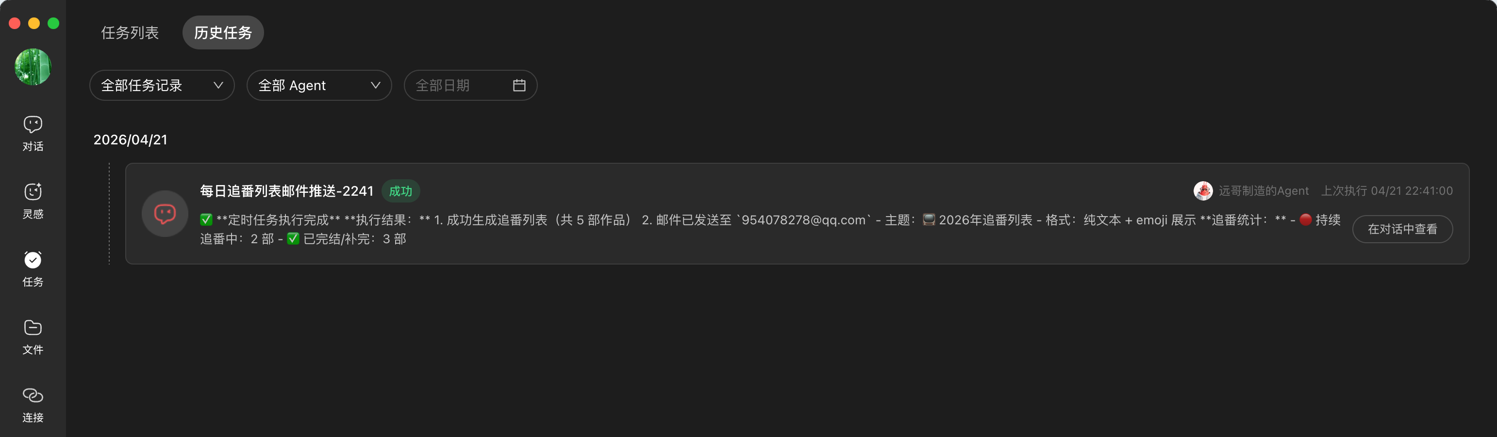 这样就可以设置定时任务,比如新增定时任务,每日 22:35 发送今年追番列表到我的邮箱中