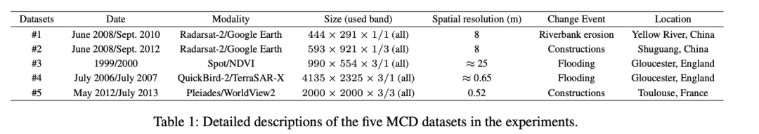 本文使用了5个公开的多模态变化检测数据集,涵盖城市土地利用变化和自然灾害场景。