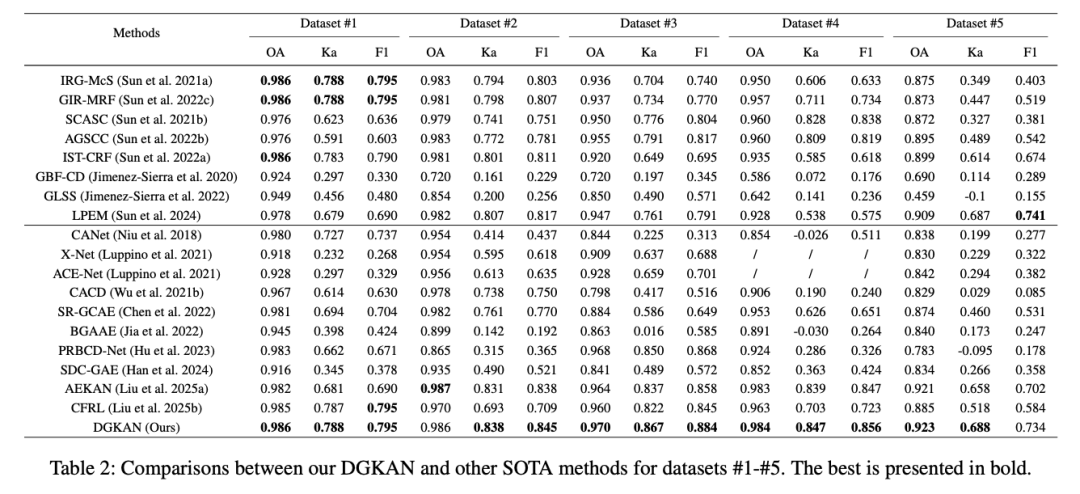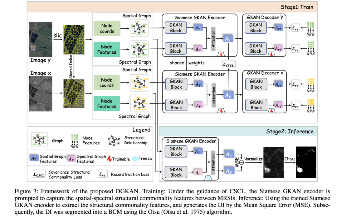 - 基于GKAN设计了双分支框架DGKAN,用于无监督多模态变化检测,能够捕获模态无关的空间-光谱结构共性特征并直接比较以检测变化