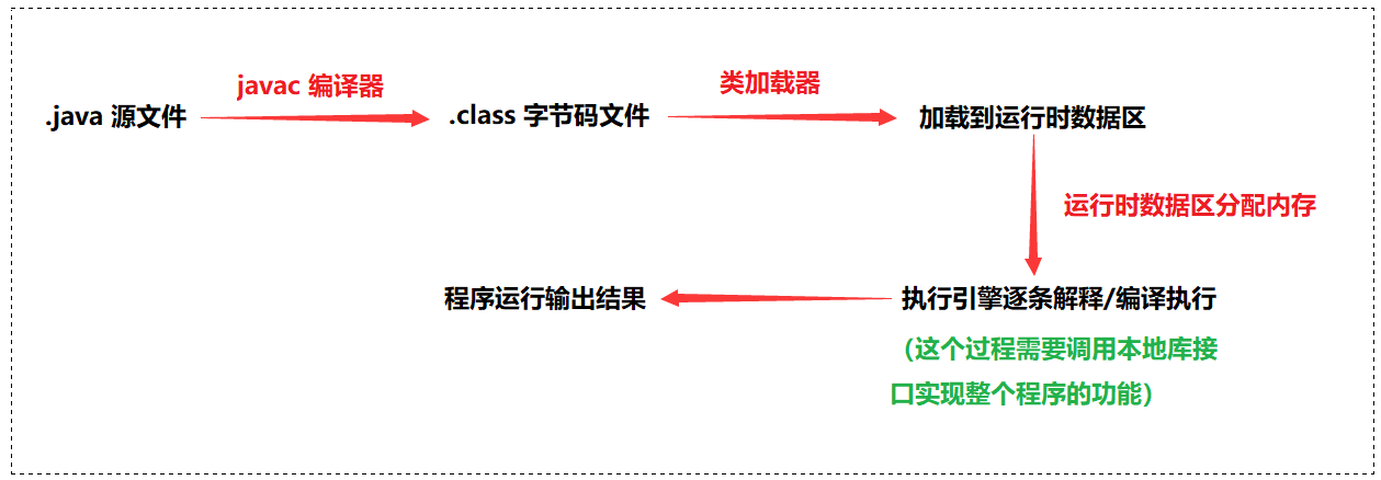 口诀:编译成 class,加载做五步,解释+JIT,运行靠内存,回收靠 GC。